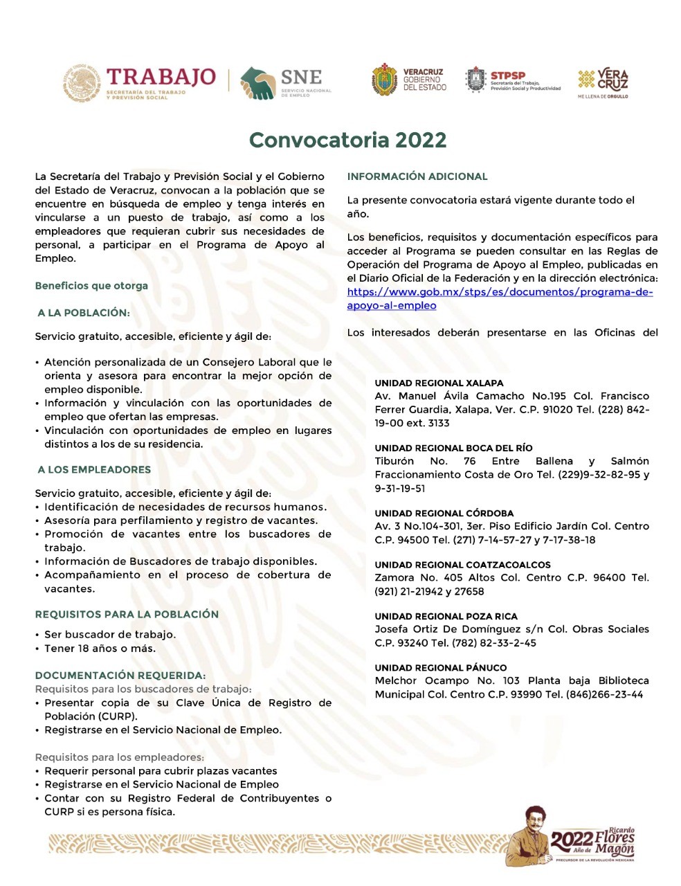 Los interesados pueden presentarse en las unidades regionales del SNE ubicadas en Boca del Río, Coatzacoalcos, Córdoba, Pánuco, Poza Rica y Xalapa, donde entregarán su CURP y harán su registro; mientras que los empresarios deben contar con RFC o CURP en caso de ser personas físicas, así como estar dados de alta en el Servicio Nacional de Empleo.