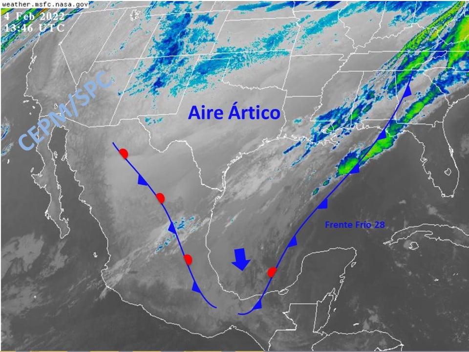 En superficie: *frente frío 28* desde un centro de baja presión en el noreste de los Estados Unidos hasta la Sonda de Campeche; *masa ártica* cubriendo el norte, noreste, centro y este del país, así como la mayor parte del Golfo de México; *vaguada* con eje sobre centro y sur del país.