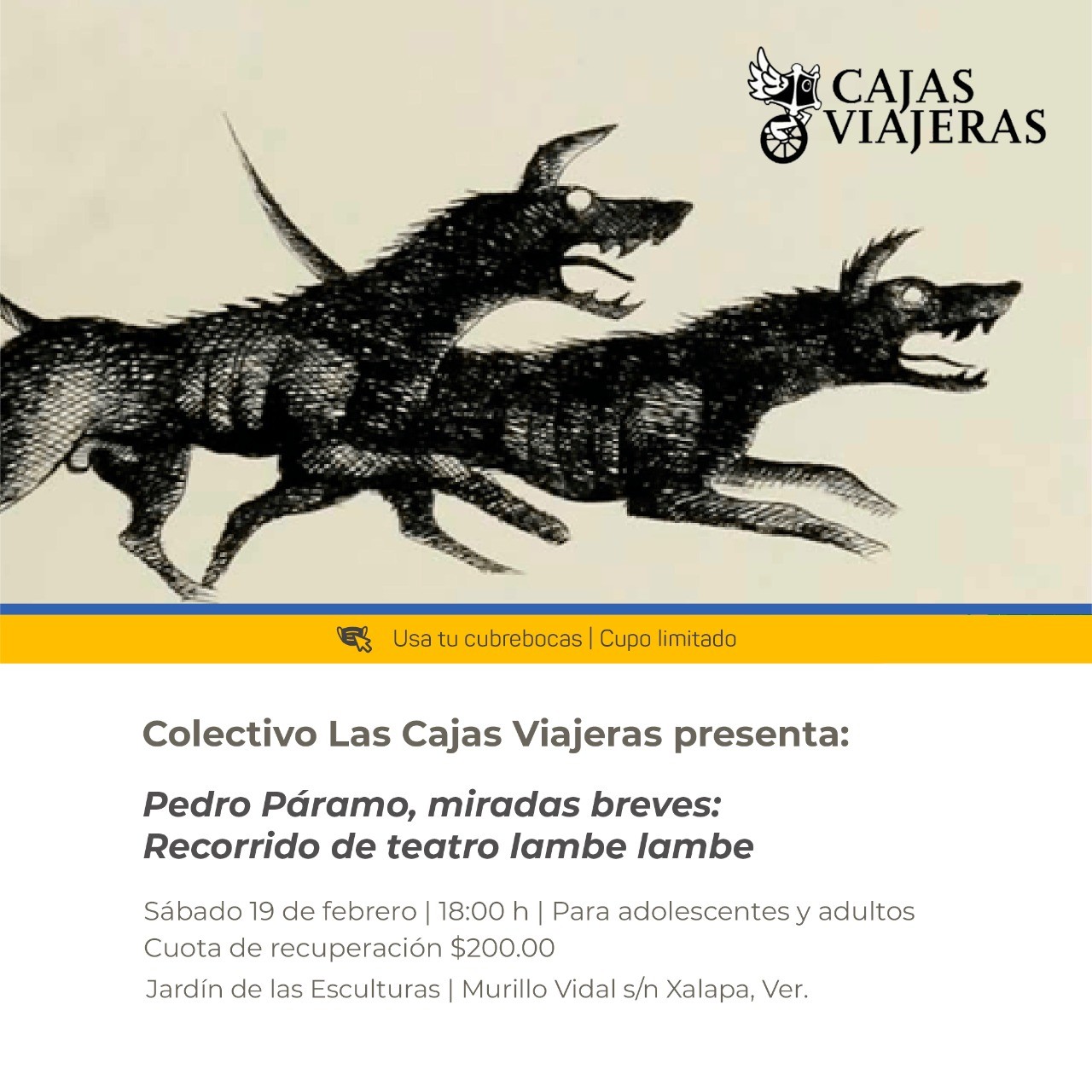 Xalapa, Veracruz.- Este sábado 19 de febrero el Colectivo Las Cajas Viajeras presenta el recorrido de Teatro Lambe Lambe: «Pedro Páramo, miradas breves», en el recinto del Jardín de las Esculturas ubicado en la capital veracruzana, en un horario de 6:00 pm.