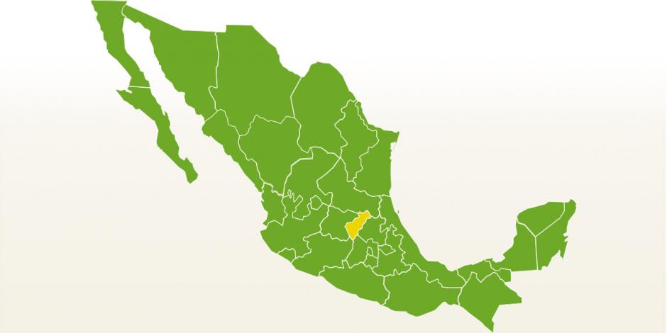 Las entidades que estaban en ese mismo color y no cambiaron son Baja California, Baja California Sur, Campeche, Chiapas, Durango, Guanajuato, Guerrero, Michoacán, Puebla, Quintana Roo, San Luis Potosí, Tabasco, Tlaxcala, Veracruz, Yucatán y Zacatecas.