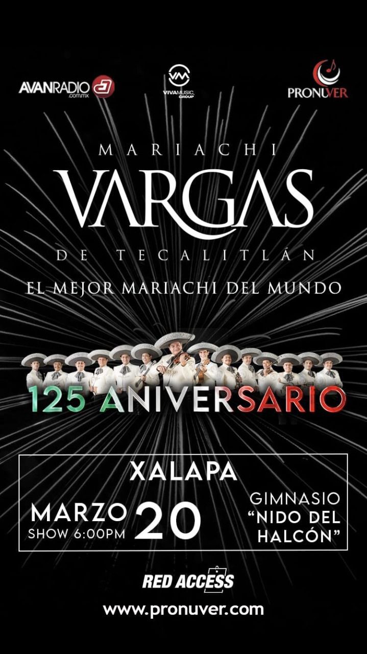 Xalapa, Veracruz.- Este próximo domingo 20 de marzo, llega a Xalapa con toda su galanura y grandes éxitos el mundialmente reconocido Mariachi Vargas de Tecalitlán. Vienen a festejar con todos los xalapeños sus 125 años de trayectoria.
