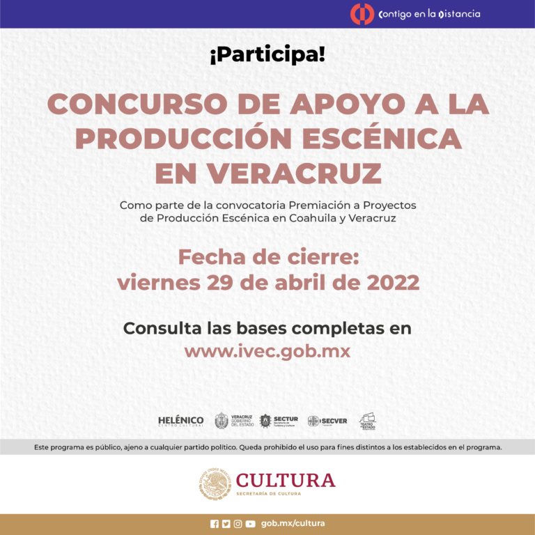 El Instituto Veracruzano de la Cultura, en coordinación con la Secretaría de Cultura Federal, a través del Centro Cultural Helénico, convocan a las y los creadores escénicos del estado a participar en la tercera emisión del Concurso de Apoyo a la Producción Escénica en Veracruz 2022. Las personas seleccionadas recibirán un apoyo económico para el desarrollo de una propuesta escénica, así como el acompañamiento y asesoría de artistas destacados.