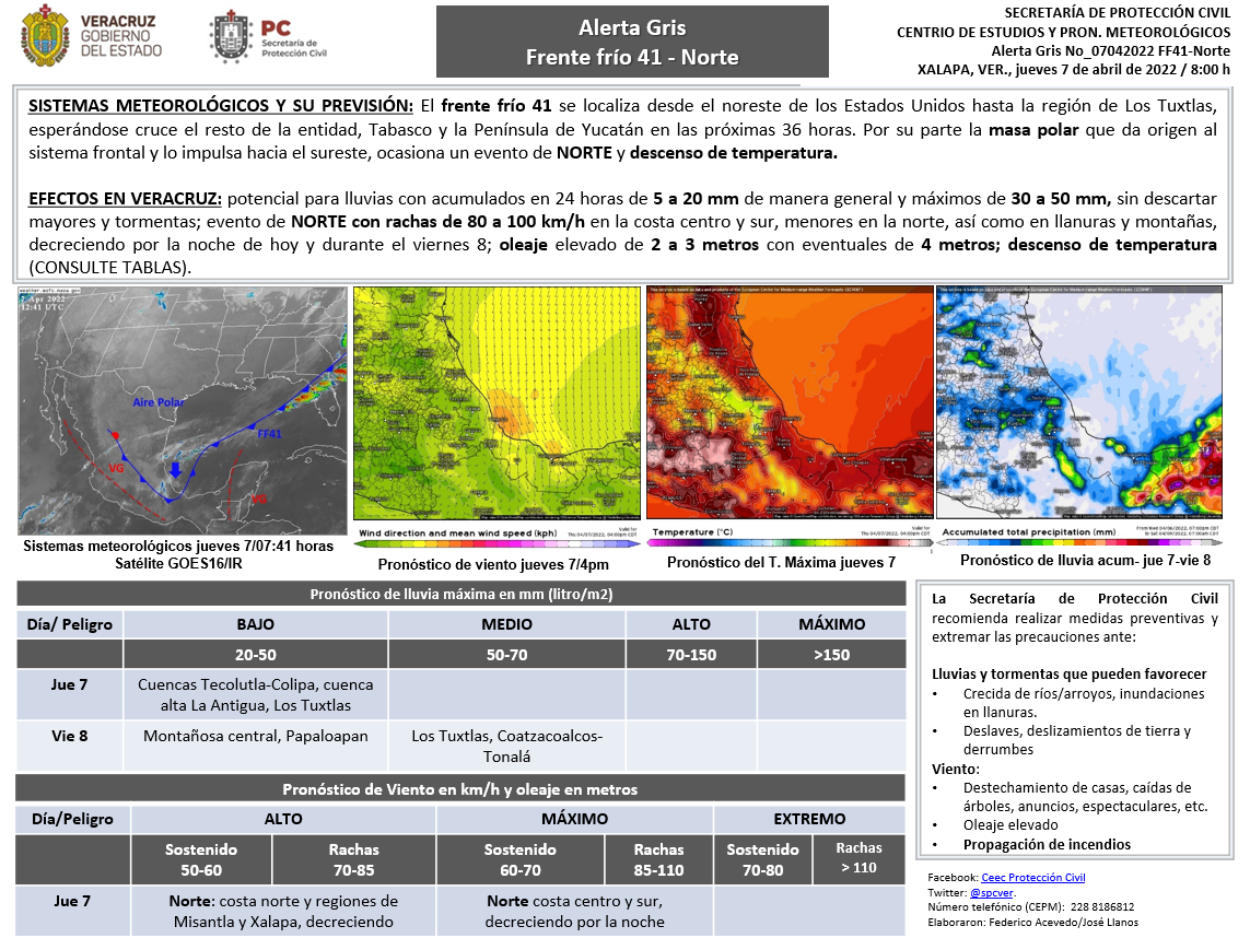 EFECTOS EN VERACRUZ: potencial para lluvias con acumulados en 24 horas de 5 a 20 mm de manera general y máximos de 30 a 50 mm, sin descartar mayores y tormentas; evento de NORTE con rachas de 80 a 100 km/h en la costa centro y sur, menores en la norte, así como en llanuras y montañas, decreciendo por la noche de hoy y durante el viernes 8; oleaje elevado de 2 a 3 metros con eventuales de 4 metros; descenso de temperatura (CONSULTE TABLAS).