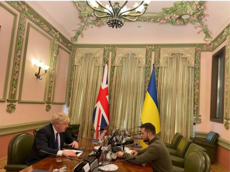 Poco antes, un miembro del gabinete de Zelenski colgó en Facebook una foto en la cual se ve a Johnson vestido con un traje oscuro, sentado frente a Zelenski, ataviado con el jersey de color caqui que usa en sus apariciones públicas desde el inicio de la guerra.