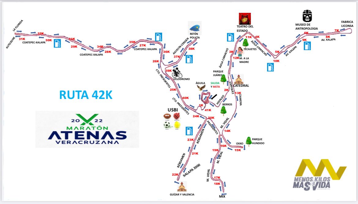 Con respecto a la ruta, Sergio Vázquez comentó que las distancias de maratón y medio maratón tendrán salida a las 6:00 horas del 24 de abril, pero las vialidades serán cerradas a partir de las 5:00 a.m., explicó que la salida y meta tendrán lugar en el Estadio Xalapeño «Heriberto Jara Corona» y que el recorrido que realizarán los competidores será por algunas de las avenidas principales de Xalapa, abarcando también el boulevard Coatepec-Xalapa hasta llegar a la entrada a La Orduña, en donde se encuentra una nueva plaza y una importante tienda de refacciones.