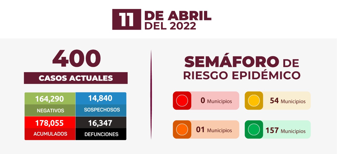 Hay 400 positivos y 144 sospechosos activos, al tiempo que van 161 mil 309 pacientes recuperados y permanecen en vigilancia 399.