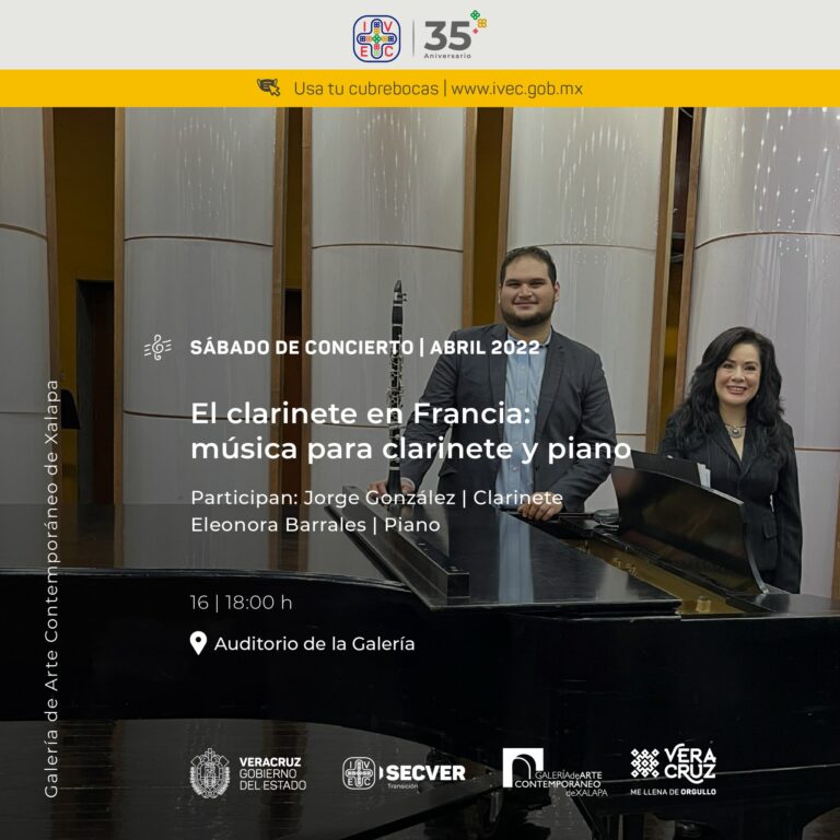 El Instituto Veracruzano de la Cultura, a través de la Galería de Arte Contemporáneo de Xalapa, invita a disfrutar de la programación de “Sábados de concierto”, iniciativa con el propósito de promover el trabajo de las y los músicos de la entidad veracruzana. El próximo sábado 16 de abril, en punto de las 18:00 horas, el auditorio de la GACX será el escenario del recital de música clásica El clarinete en Francia: música para clarinete y piano, interpretado por los instrumentistas Jorge González y Eleonora Barrales.