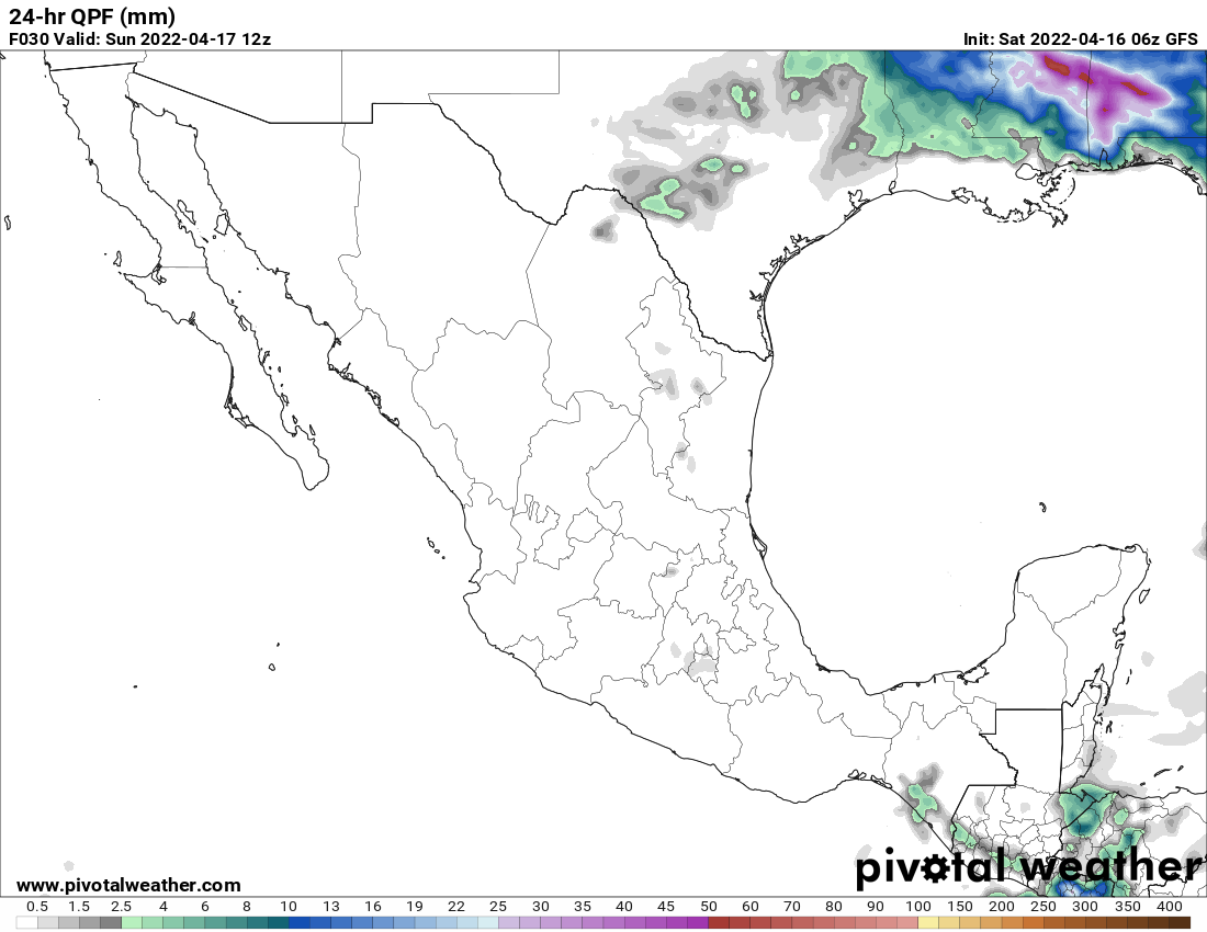 En las próximas 24 horas se espera probabilidad baja de lluvias y tormentas y sólo se esperan algunos eventos muy dispersos en el noreste, centro y sureste del país. El calor continuará en la mayor parte del territorio nacional con los valores de la temperatura máxima ligeramente más altos, esperándose los máximos en el sur de Sonora, Sinaloa, Nayarit, Jalisco, suroeste de Guanajuato, Colima, Michoacán, Guerrero, Morelos, suroeste de Puebla, Oaxaca, Chiapas, Coahuila, Nuevo León, Tamaulipas, centro-sureste de San Luis Potosí, Veracruz, Tabasco y entidades de la Península de Yucatán. Por otra parte, las temperaturas mínimas más bajas se prevén en entidades del noroeste, norte y centro del país, persistiendo las heladas ligeras en la Sierra Madre Occidental. En el litoral y Golfo de México, se prevé viento del Sureste, Este y Noreste de 20 a 35 km/h con rachas de 40 a 55 km/h en la sonda de Campeche por la tarde-noche. En el litoral del Pacífico Mexicano se prevé viento del Noroeste y Oeste 20 a 35 km/h con rachas de 40 a 55 km/h en la Península de Baja California.
