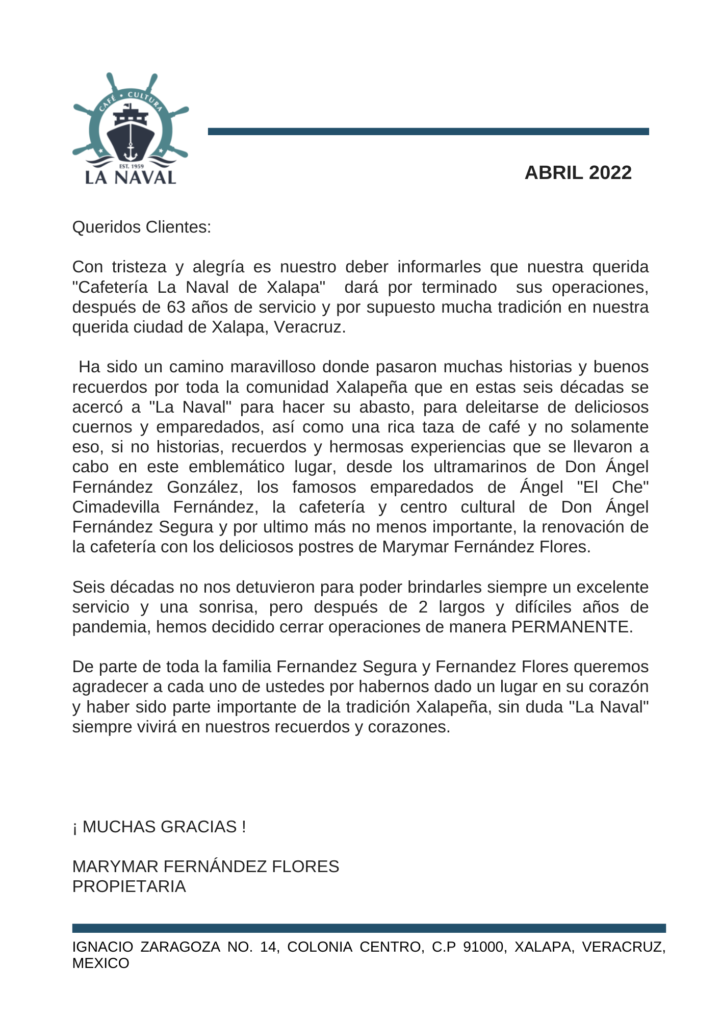 Así mismo, el comunicado narra que después de los difíciles años de pandemia, han decidido cerrar operaciones de manera permanente: «De parte de toda la familia Fernández Segura y Fernández Flores queremos agradecer a cada uno de ustedes por habernos dado un lugar en su corazón y haber sido parte importante de la tradición xalapeña, sin duda La Naval siempre vivirá en nuestros recuerdos y corazones«, Puntualiza el escrito.