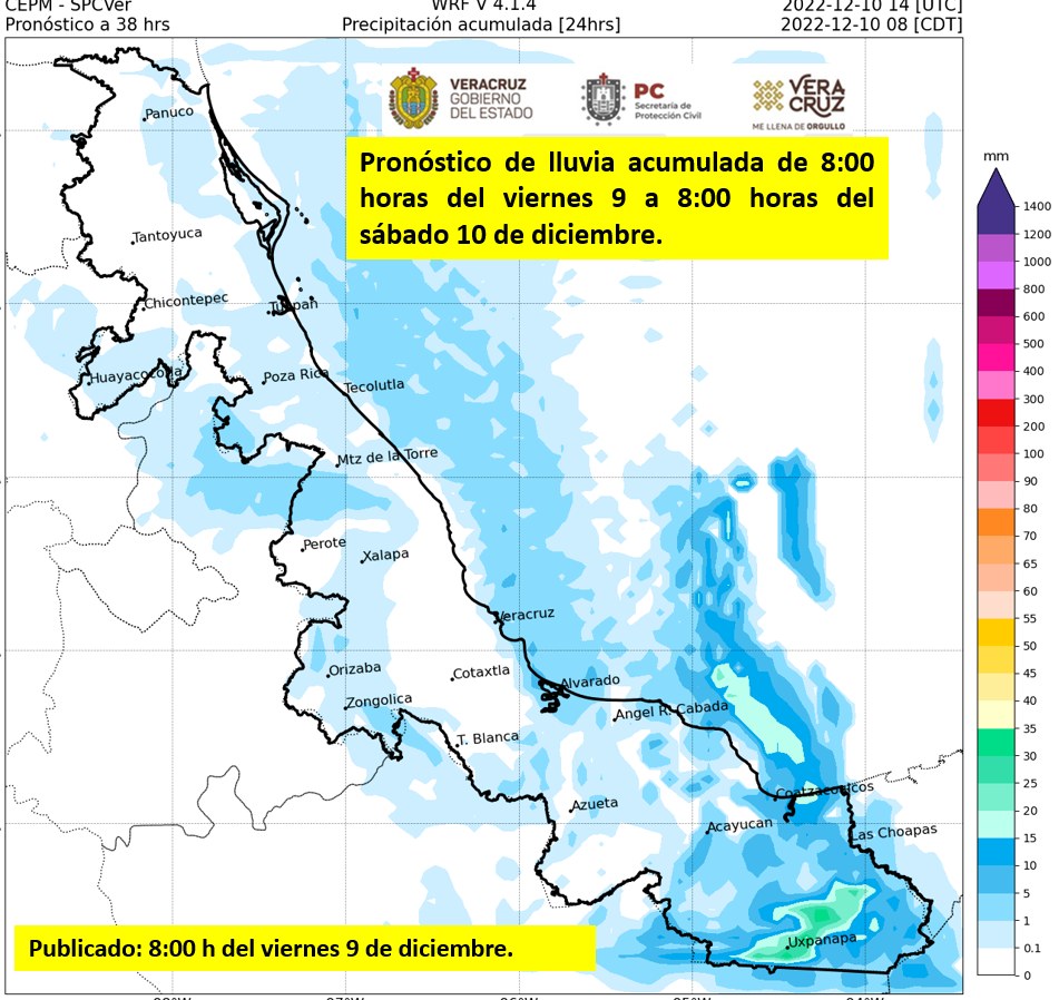 Nublado a medio nublado con probables lluvias-chubascos aislados de 5 a 15 mm, disminuye el potencial mañana. Viento del Noreste de 20 a 35 km/h con rachas en costas. Ambiente diurno relativamente cálido y fresco por la tardenoche en zonas de llanura y frío en montañas con heladas ligeras al amanecer. T. máx./T. mín. (°C): Orizaba 22/13; Tierra Blanca 31/20; Cosamaloapan 30/20; Alvarado 29/18, A.R. Cabada 29/18; Catemaco 28/17; S. J. Evangelista 29/21.