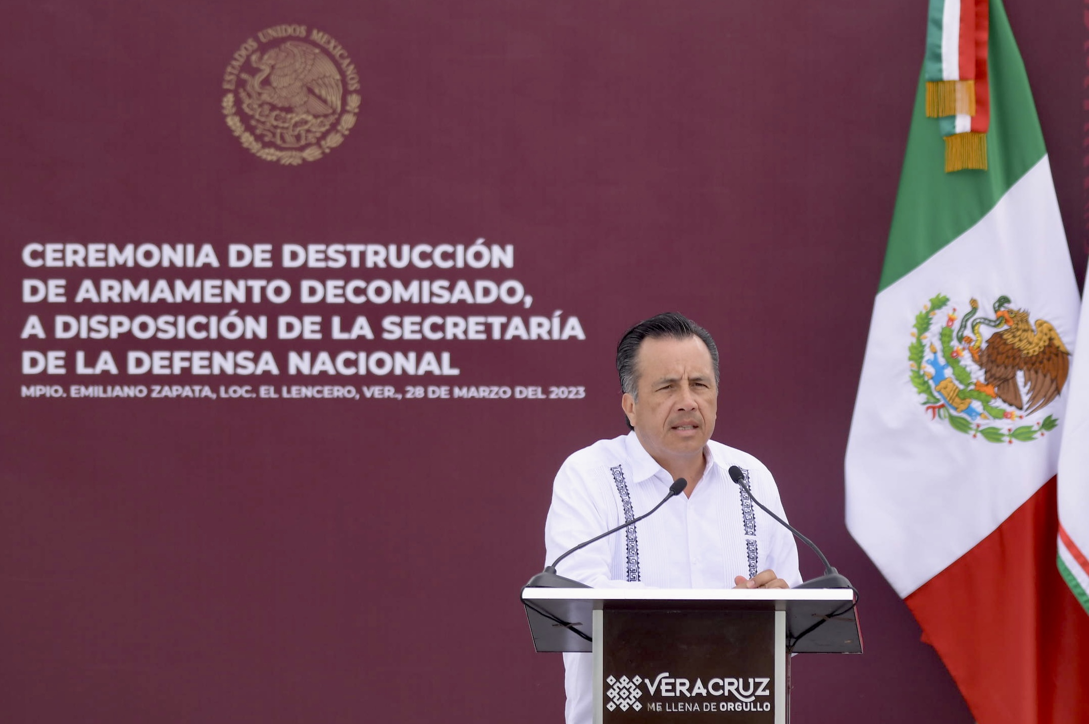 “La política del presidente Andrés Manuel López Obrador, de ir al fondo del problema de inseguridad, va teniendo resultados muy palpables en la construcción de la paz; por eso cada vez que un arma es asegurada, muchas vidas son salvadas”, expresó el gobernador Cuitláhuac García Jiménez.