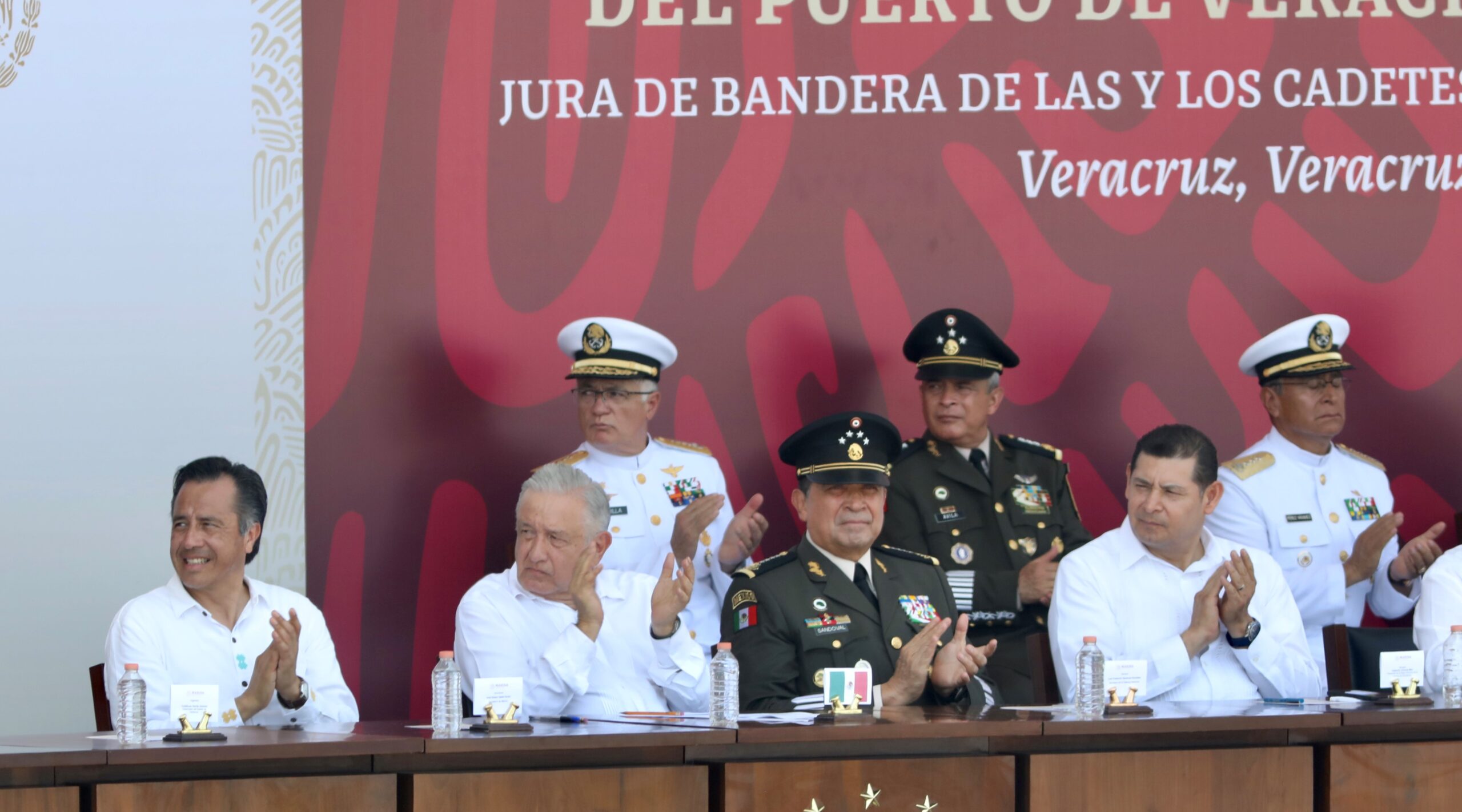 También el comandante de la Guardia Nacional, General David Córdova Campos; el subsecretario de Derechos Humanos, Población y Migración, Alejandro Encinas Rodríguez, y el presidente del Senado de la República, Alejandro Armenta Mier; entre otras autoridades navales, militares y civiles.