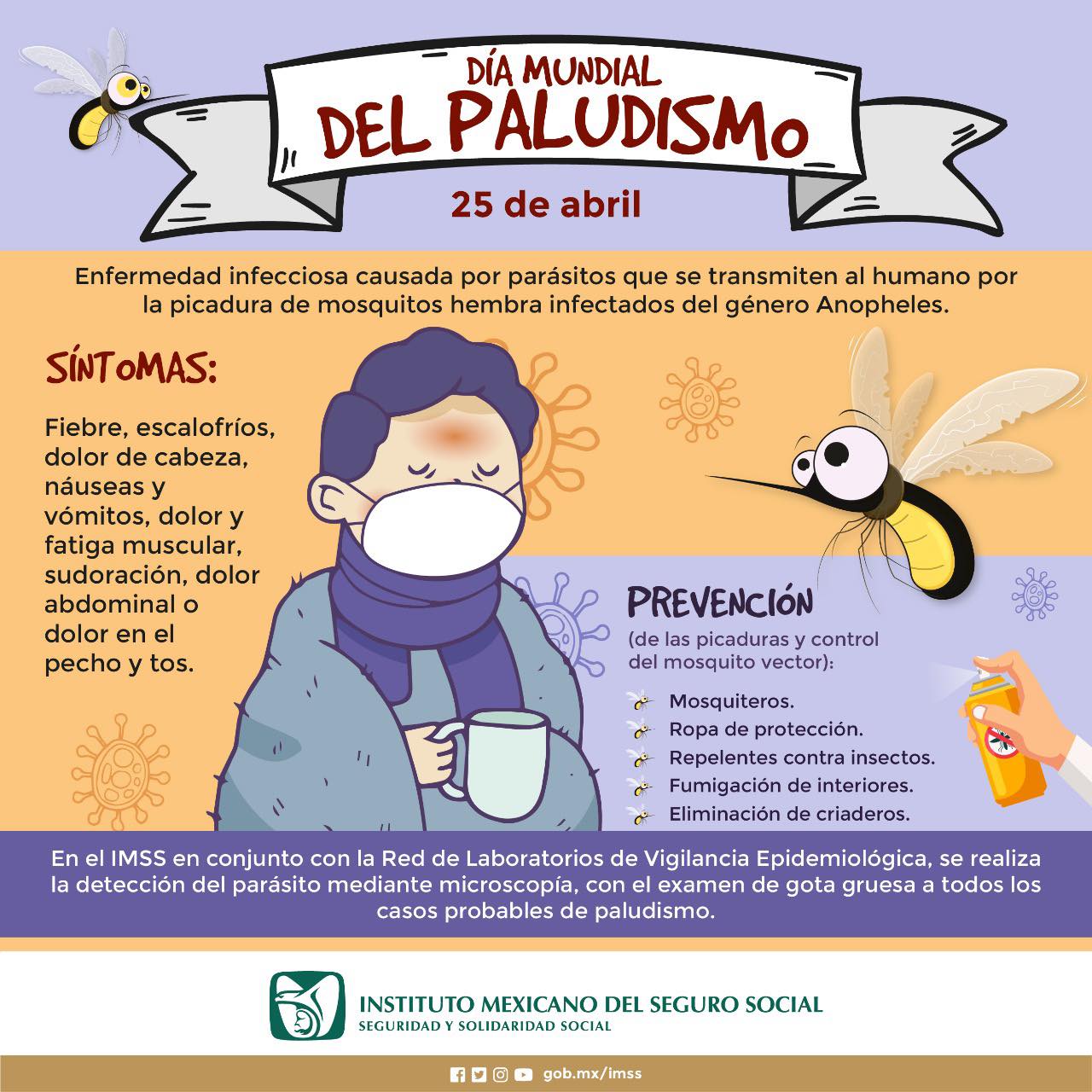 Al conmemorarse el Día Mundial del Paludismo el 25 de abril, el Instituto Mexicano del Seguro Social (IMSS) en Veracruz Sur informa a la población que los síntomas de este padecimiento son similares a los del dengue y es causado por mosquitos que se reproducen en agua dulce, por lo que, se recomienda aplicar medidas preventivas.