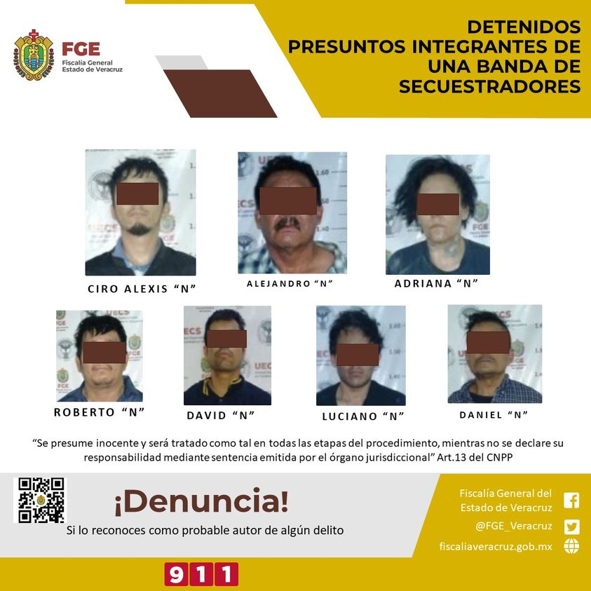 La Fiscalía General del Estado, que encabeza Verónica Hernández Giadáns, informa que, mediante un operativo en el municipio de Fortín de la Flores, elementos de la Unidad Especializada en Combate al Secuestro detuvieron a siete personas, presuntos integrantes de una banda de secuestradores y liberaron a dos víctimas que se presume se encontraban privadas de su libertad.