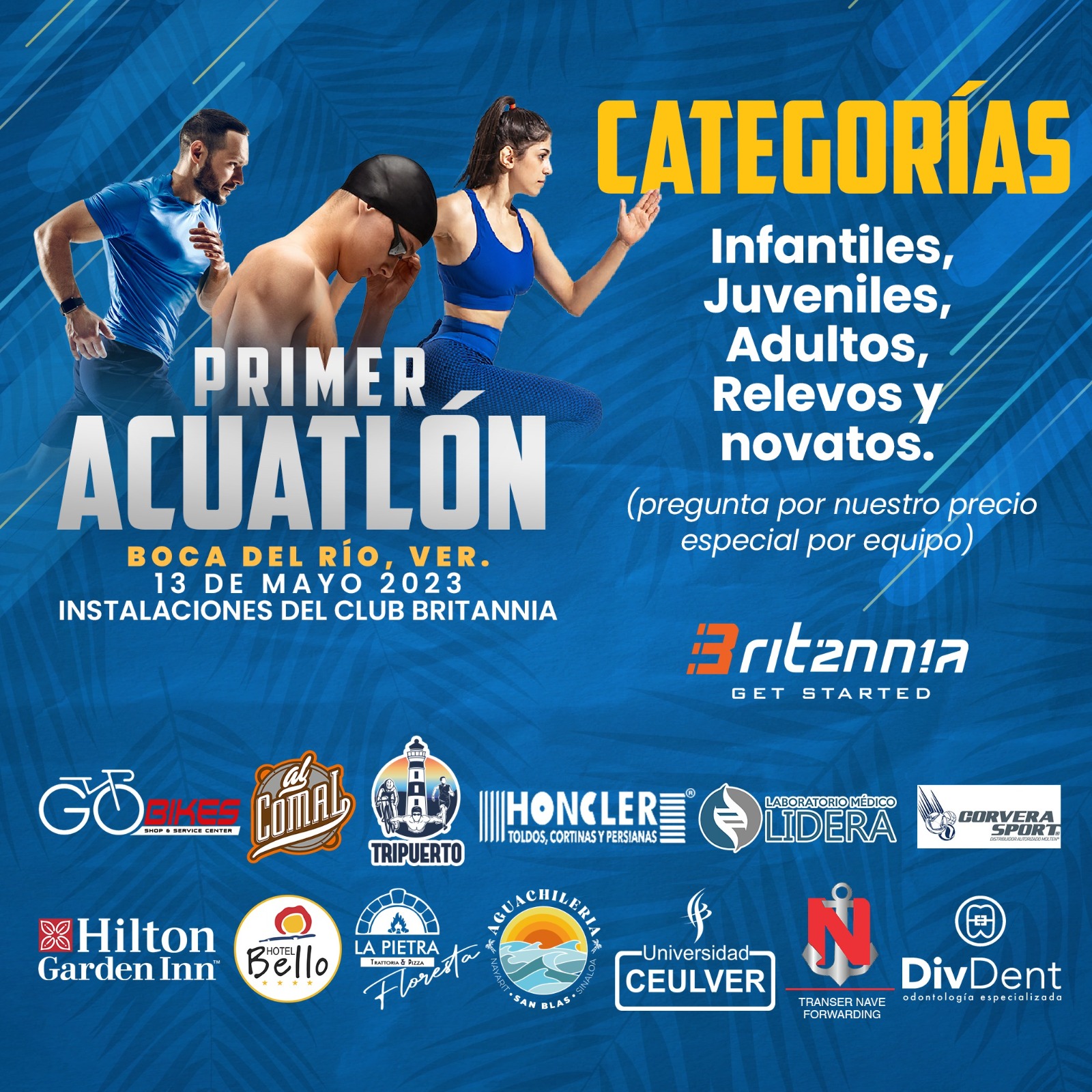 El Comité Organizador del Acuatlón Britannia agradece el respaldo y apoyo de sus parocinadores: Laboratorio Lidera, Hotel Hilton Garden Inn, Honcler, Al Comal, Universidad CEULVER, Go Bikes, Hotel Bello, La PIETRA, AGUACHILERÍA San Blas, Transer Nave Forwarding y DivDent.