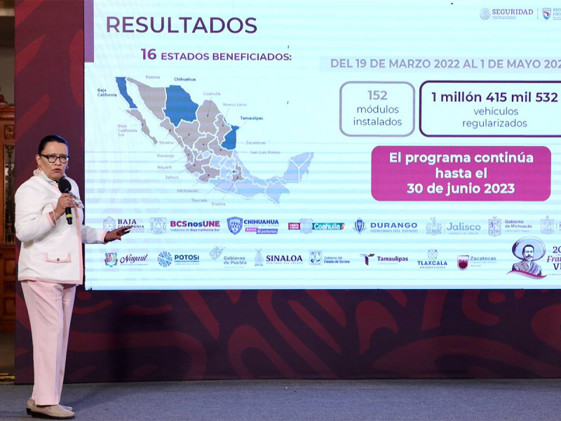 Hay 152 módulos instalados.Del 19 de marzo de 2022 al 1 de mayo de este año se llevan un millón 415 mil 532 vehículos regularizados. El programa por instrucción del presidente tendrá vigencia hasta el 30 de junio próximo”, explicó la funcionaria en Palacio Nacional.