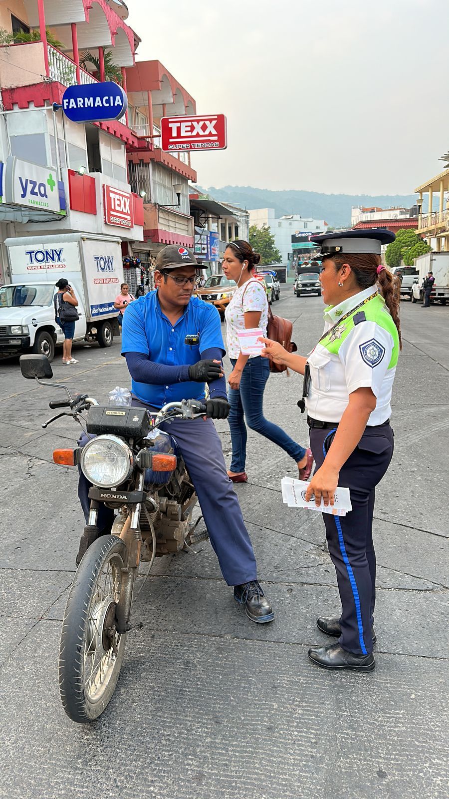 Como parte de las acciones preventivas, elementos de la Secretaría de Seguridad Pública (SSP), a través de la Dirección General de Tránsito y Seguridad Vial repartieron trípticos a peatones y conductores de motocicletas para prevenir accidentes y fomentar la cultura vial.