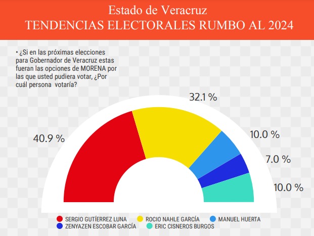 Para la gubernatura, Sergio Gutiérrez Luna, diputado federal veracruzano, mantiene el primer lugar por segunda ocasión consecutiva con el 40.9 por ciento y más de ocho puntos abajo se coloca el segundo lugar.