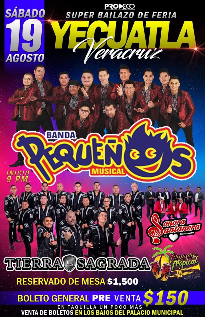 La cartelera para el día sábado 19 de agosto estará conformada por la Banda Pequeños Musical, quienes serán el grupo principal, alternados por Tierra Caliente, La Sonora Santanera y Crucero Musical, un grupo local, con un costo de $150 pesos la entrada general. Los boletos podrán adquirirse en los bajos del palacio municipal de Yecuatla, Veracruz.