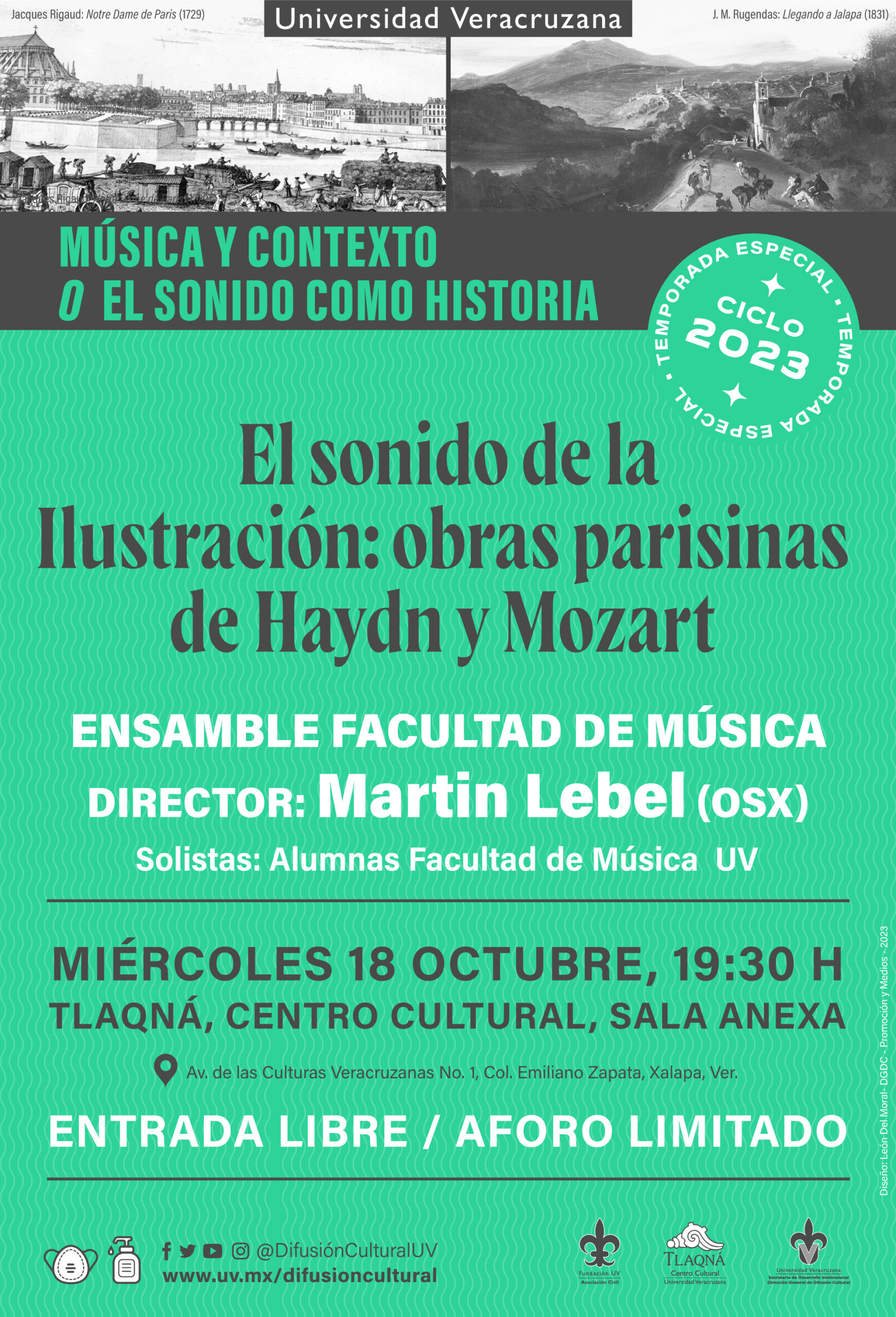 Este concierto se relaciona con la importancia de París como uno de los centros intelectuales y culturales de la Ilustración, así como para reflexionar sobre la dimensión novohispana/mexicana de la misma. Por ello, el programa de mano contendrá cuatro textos de academic@s de la Universidad Veracruzana: uno sobre la Ilustración en Francia, de Adriana Menassé, del Instituto de Filosofía, y de Nora Nolasco, de la Facultad de Filosofía, sobre la Ilustración en la Nueva España; otro de Gladys Villegas sobre la traza urbanística del París de la Ilustración y otro de Alfonso Rodríguez Pulido sobre ese mismo tema en la Xalapa de finales del siglo XVIII; estos últimos dos académic@s son de la Facultad de Arquitectura.