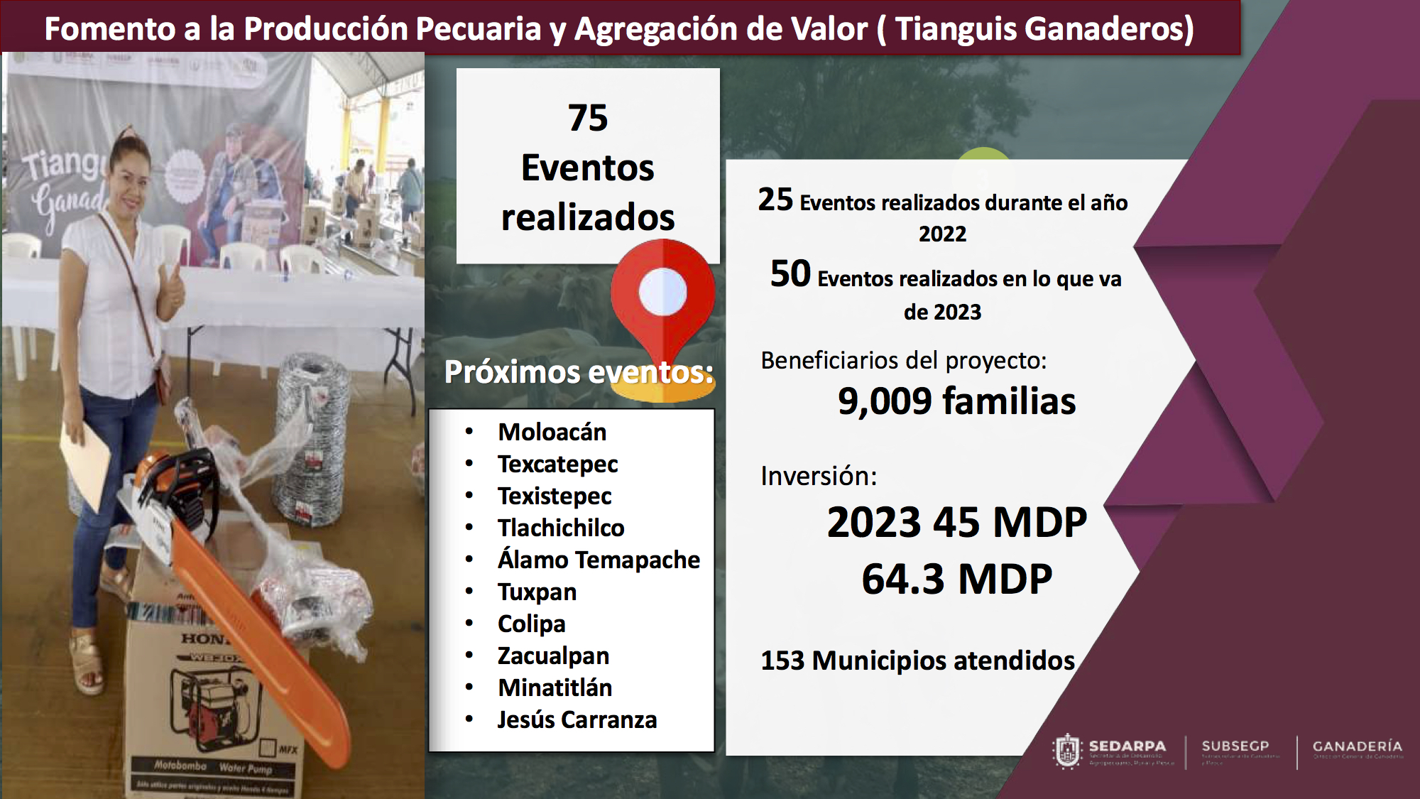 Se trata de un esfuerzo tripartita en el que la administración estatal ha aportado 64.3 millones de pesos para 75 eventos regionales que agrupan a diversas localidades, 50 de éstos en lo que va del presente año con una suma de 45 mdp; “una forma de llegar a los productores sin intermediarios y apoyados por ayuntamientos y asociaciones ganaderas”.