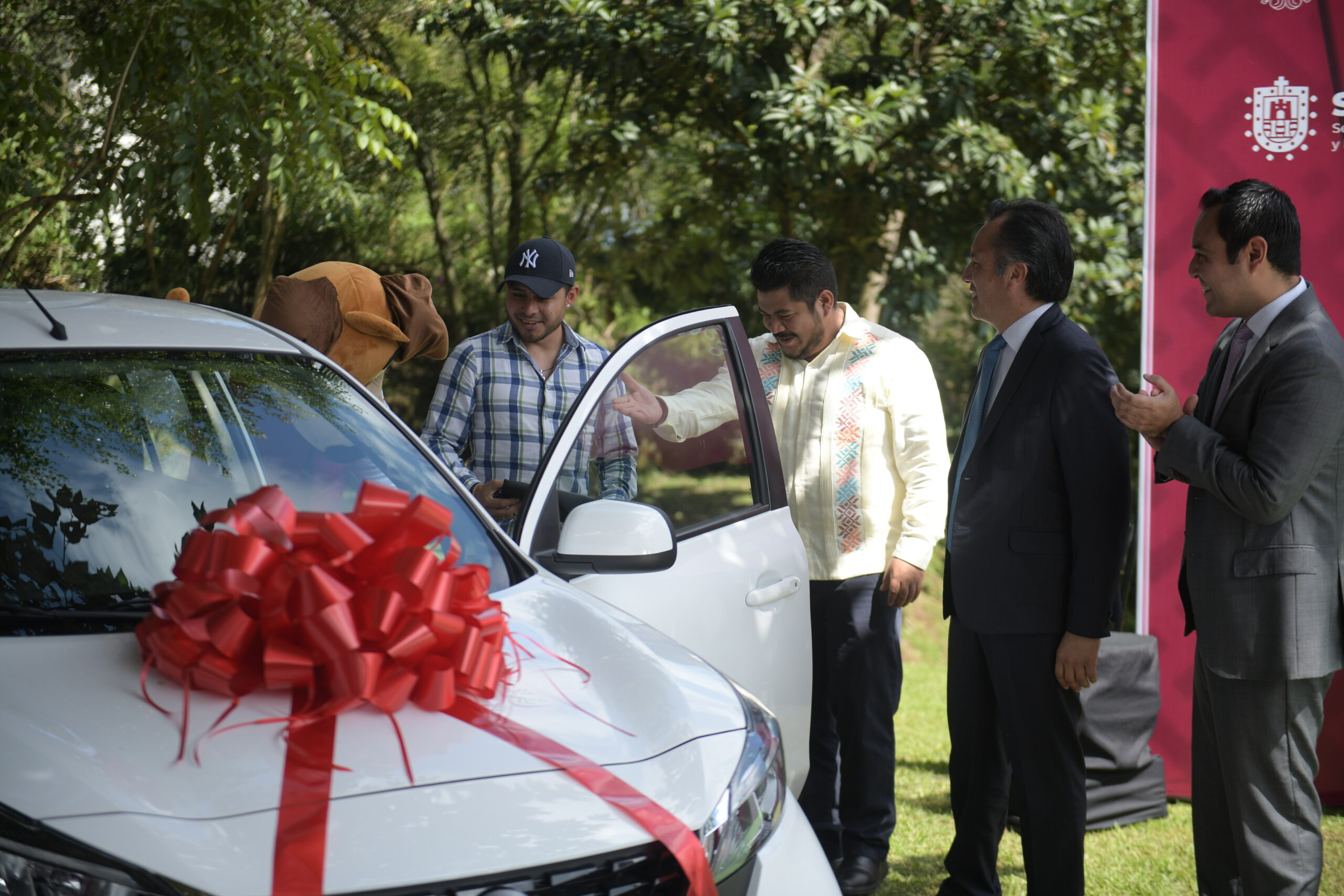 Junto con el subsecretario de Ingresos, Diego David Meléndez Bravo; la notaria pública 33, Hortensia Alarcón Montero, y la interventora de la Secretaría de Gobernación, Soledad Gabriela Betanzos Cepeda, el Gobernador y el Secretario entregaron las llaves y acompañaron a los ganadores hasta su automóvil.