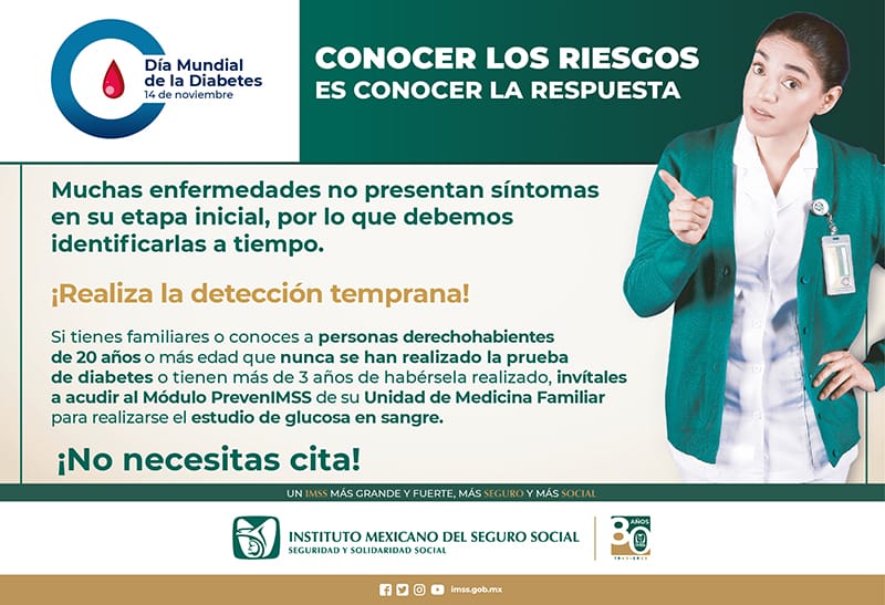 Asimismo, recomendó asistir al menos una vez al mes a su Unidad de Medicina Familiar (UMF) a realizarse sus Chequeos PrevenIMSS para monitorear sus niveles de glucosa y llevar el tratamiento adecuado para evitar mayores complicaciones a futuro.