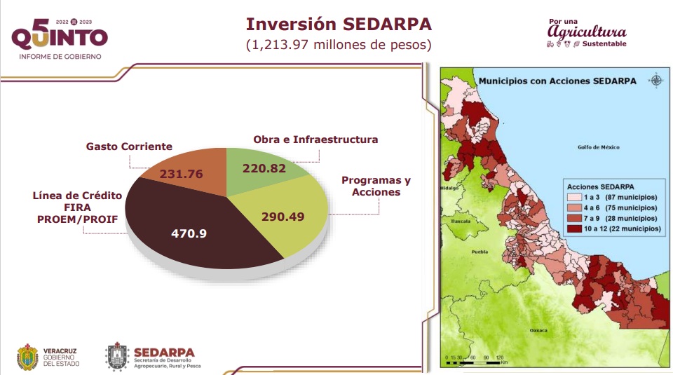 Durante la Glosa del Quinto Informe de Gobierno, precisó que la inversión en el sector este 2023 fue de mil 217 millones de pesos dirigidos a proyectos de desarrollo rural, capacitación y transferencia de tecnologías, equipo, financiamiento y entrega de créditos, además del impulso de una ganadería regenerativa y la acuacultura, todo bajo una visión sustentable.
