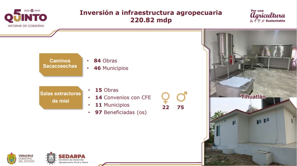 También la rehabilitación de 84 caminos sacacosechas en 46 municipios, 15 mil apoyos de maquinaria, la construcción y equipamiento de 15 salas para extracción de miel y distribución de insumos en 207 municipios, mientras que el Seguro Agrícola Catastrófico indemnizó a 3 mil 964 agricultores por afectaciones de cultivos en 5 mil 103 hectáreas, esto mediante 7.7 millones de pesos.