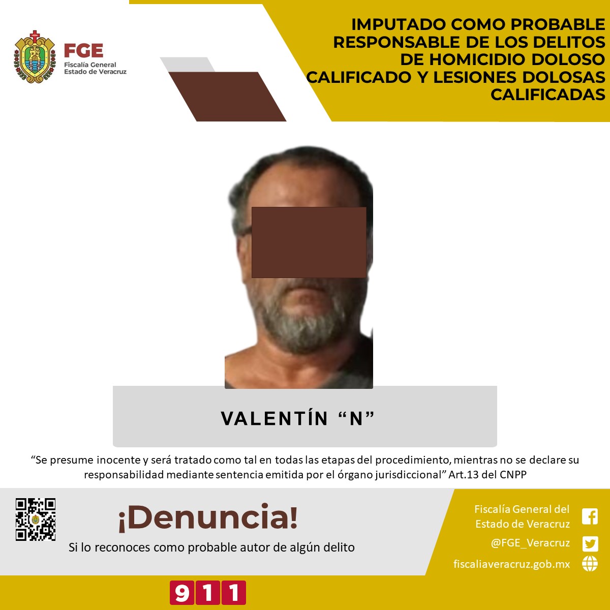Veracruz, Ver., La Fiscalía Regional Veracruz realizó imputación en contra de Valentín “N” como probable responsable de los delitos de homicidio doloso calificado y lesiones dolosas calificadas.