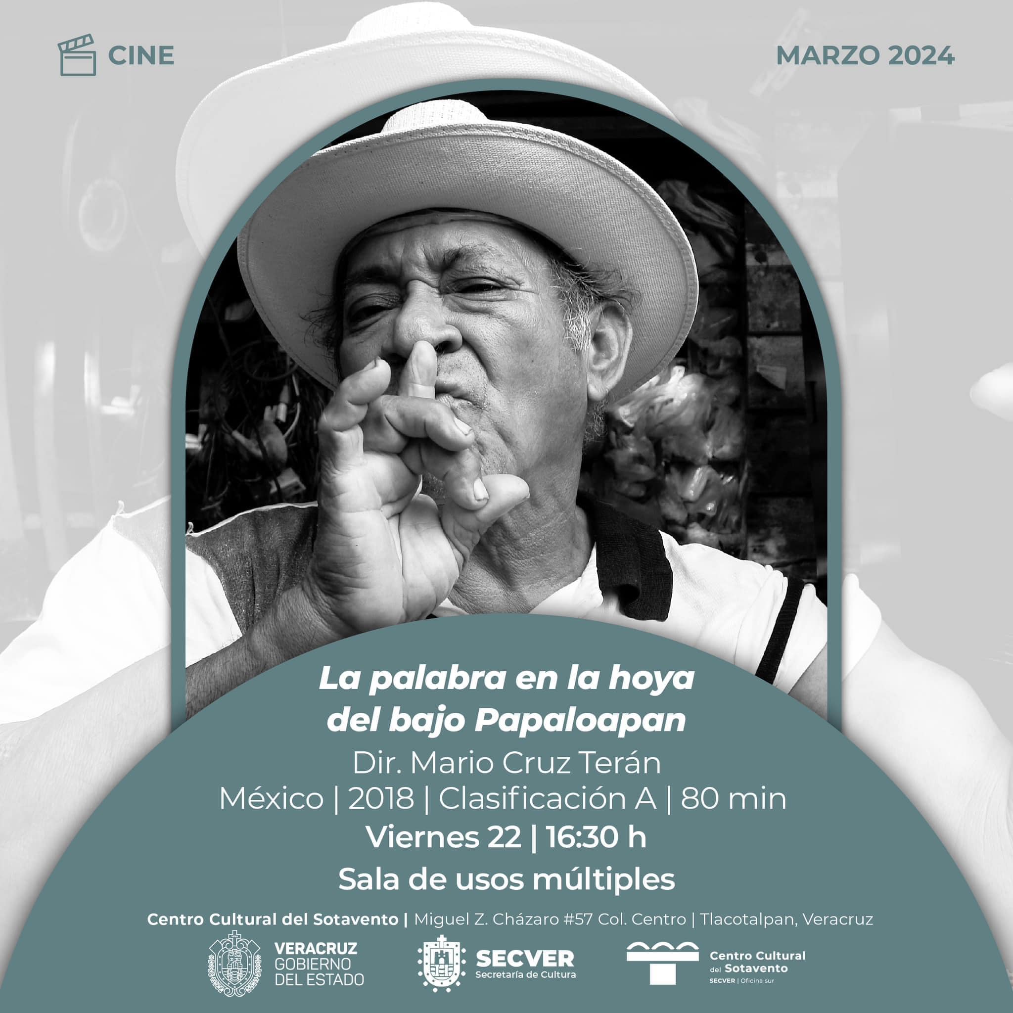 La Secretaría de Cultura de Veracruz, a través del Centro Cultural del Sotavento, invita al público a la proyección del documental La palabra en la hoya del bajo Papaloapan, dirigido por el fotógrafo y gestor cultural Mario Cruz Terán. La función tendrá lugar el viernes 22 de marzo a las 16:30 horas, en la sala de usos múltiples del recinto tlacotalpeño. La entrada es libre.
