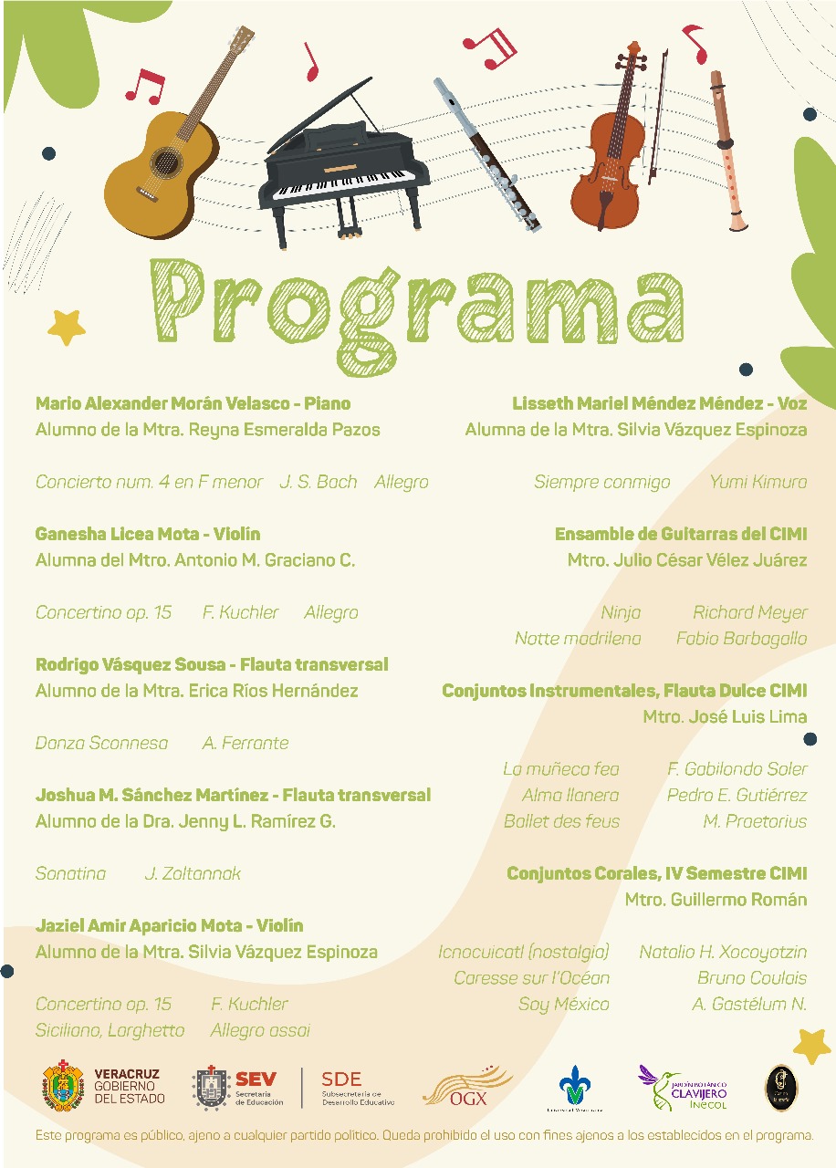 El programa a presenciar se enriquece con un grupo de solista: Mario Alexander Morán Velazco en el piano, Ganesha Licea Mota y Jasiel Amir Aparicio Mota en el Violin, Rodrigo Vásquez Sousa y Joshua M. Sanchez Martines en la Flauta transversal así como Lisseth Mariel Méndez Méndez, quien deleita con su peculiar Voz, no menos importante se suma la participacion del ensamble de Guitarras del CIMI, los conjuntos de Coro e instrumental (flautas).