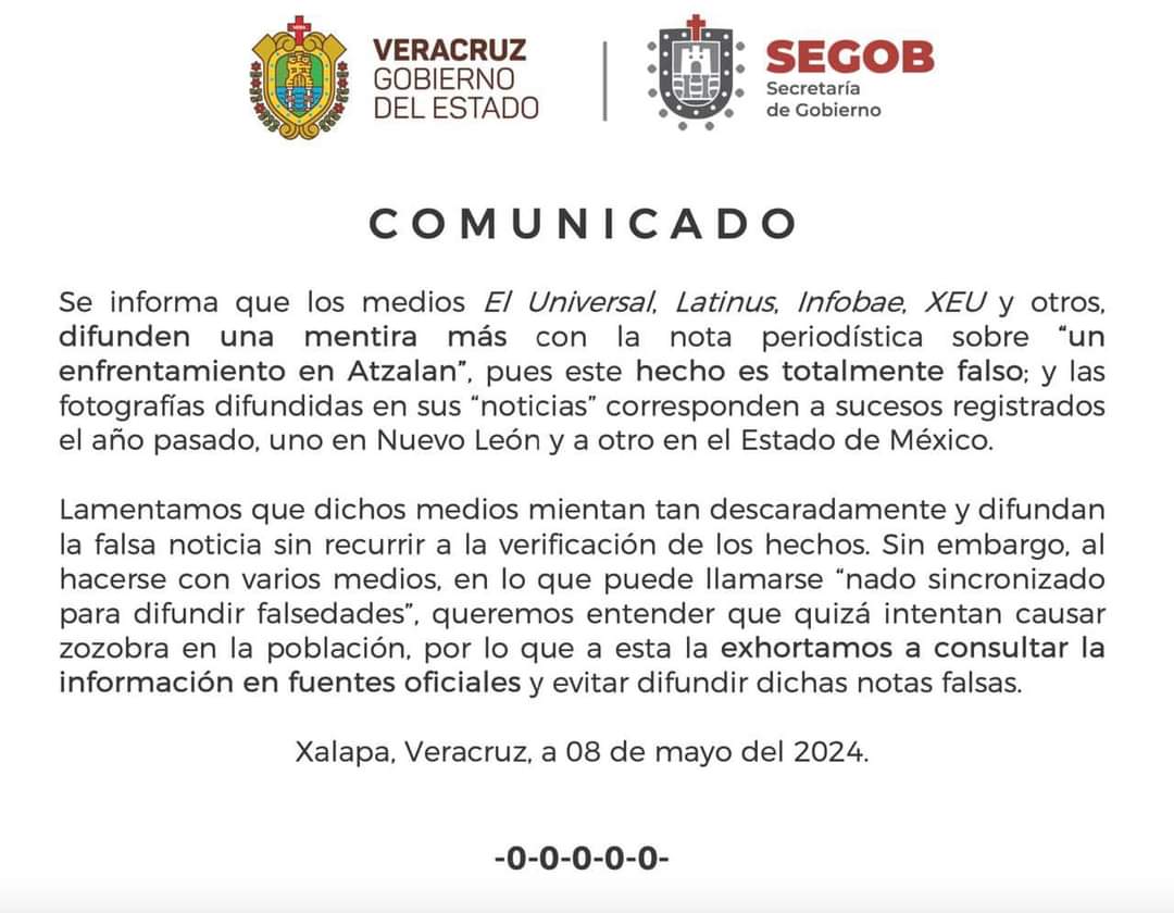 Mediante un comunicado la Secretaria de Gobierno del estado de Veracruz, desmiente las publicaciones que hicieron varios medios de comunicación sobre un presunto enfrentamiento en el municipio de Atzalan.