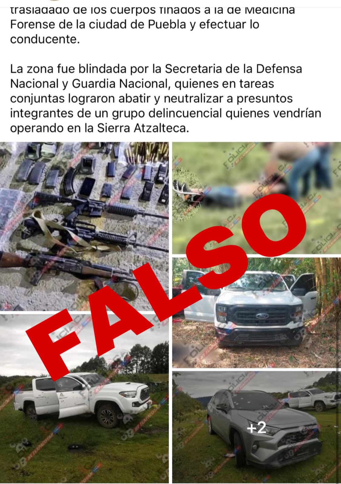 Se informa que los medios El Universal, Latinus, Infobae, XEU y otros, difunden una mentira más con la nota periodística sobre “un enfrentamiento en Atzalan”, pues este hecho es totalmente falso; y las fotografías difundidas en sus “noticias” corresponden a sucesos registrados el año pasado, uno en Nuevo León y a otro en el Estado de México.