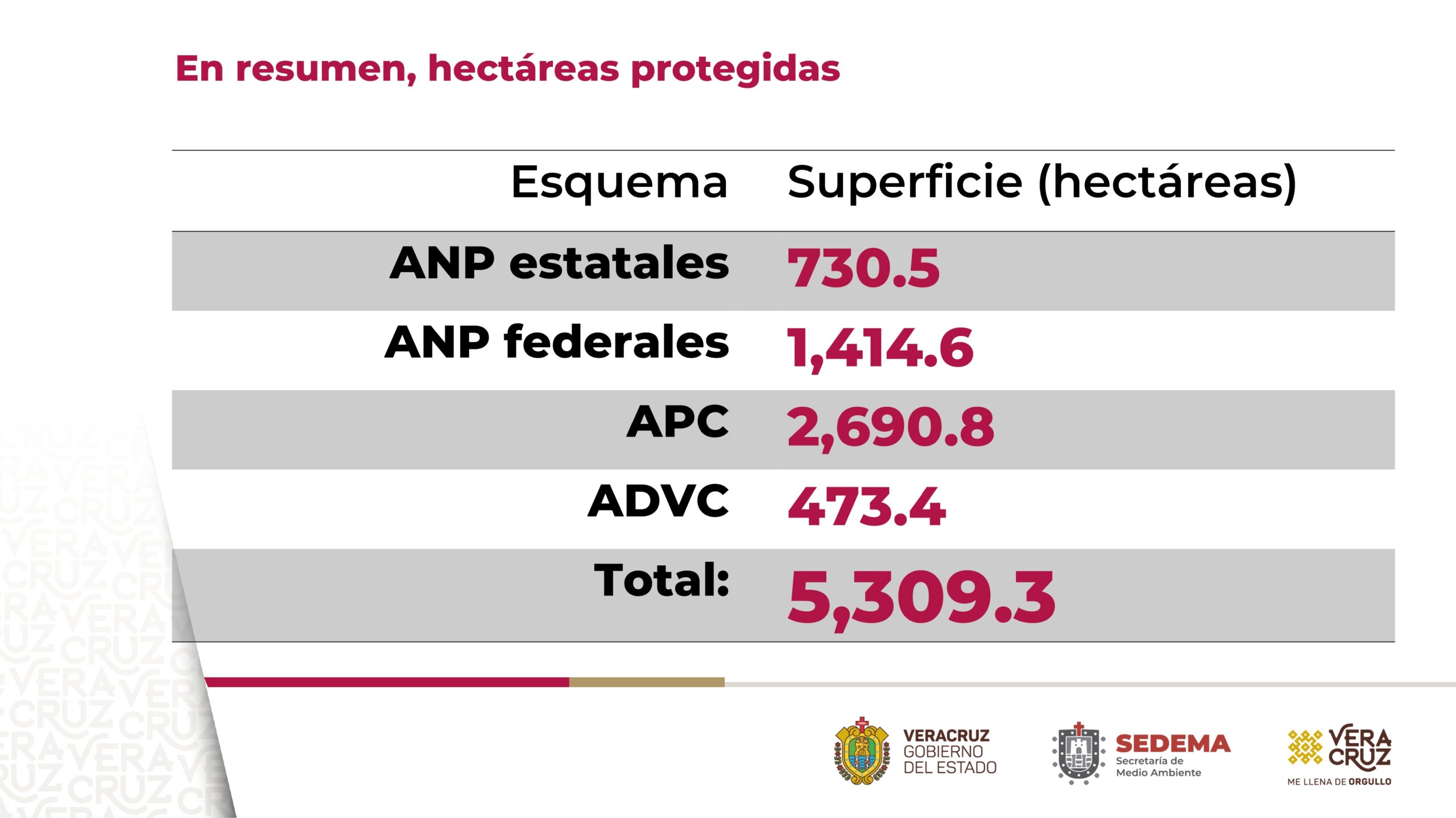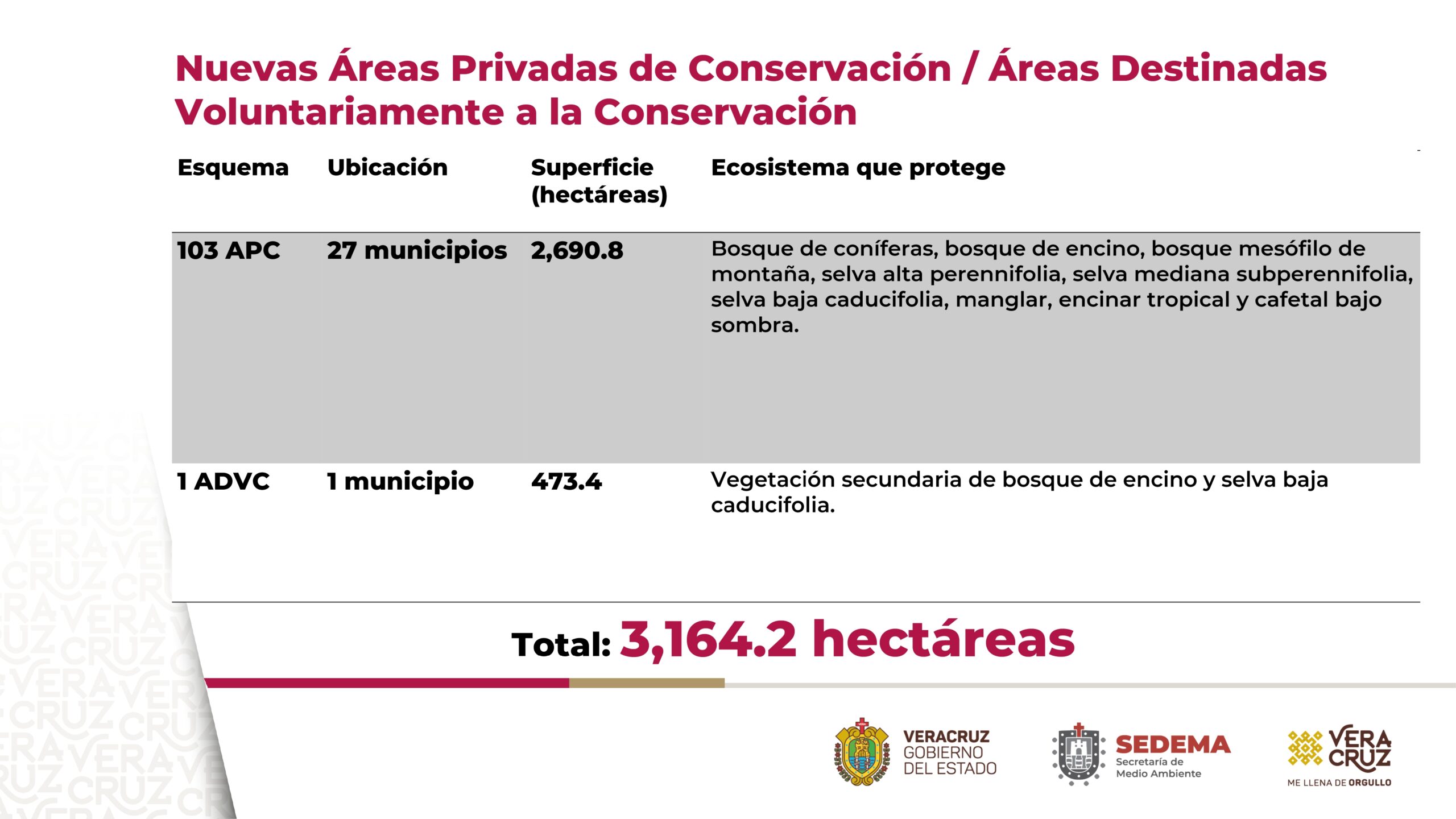 En cuanto a las áreas privadas y voluntarias de conservación, suman 3 mil 164.2 hectáreas en 28 municipios, a la par se trabaja en programas de manejo forestal en San Felipe II de Uxpanapa, Cerro del Algodón en Misantla, San Pedro del Monte y el Tejar Garnica en Xalapa.