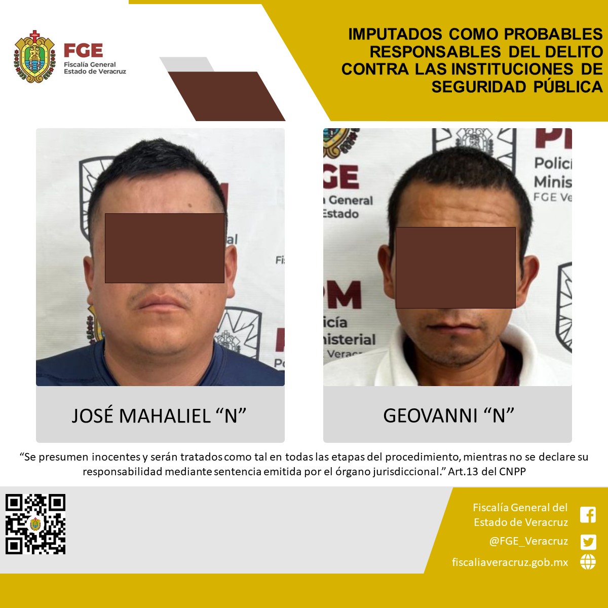 Xalapa, Ver., 22 de julio 2024.- La Fiscalía Regional Xalapa realizó imputación en contra de José Mahaliel “N” y Geovanni “N”, elementos de la Policía Municipal de Banderilla, como probables responsables del delito contra las instituciones de seguridad pública, dentro del proceso penal 848/2024.