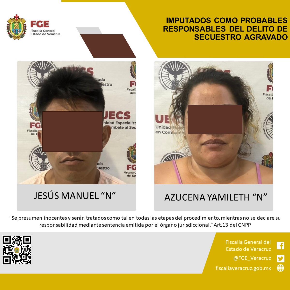 Acayucan, Ver., La Unidad Especializada en Combate al Secuestro realizó imputación en contra de Azucena Yamileth “N” y Jesús Manuel “N” como probables responsables del delito de secuestro agravado en agravio de un menor de edad de origen Hondureño, mismo que fue liberado mediante un operativo policiaco.