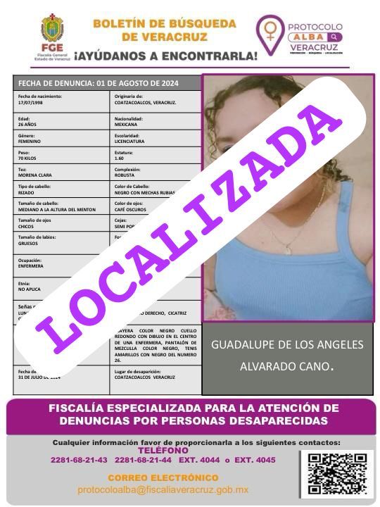 Xalapa, Ver.,-La Fiscalía General del Estado informa que se ha localizado a la enfermera Guadalupe de los Ángeles “N”, quien fue reportada como desaparecida por sus familiares el pasado 31 de julio en Coatzacoalcos.