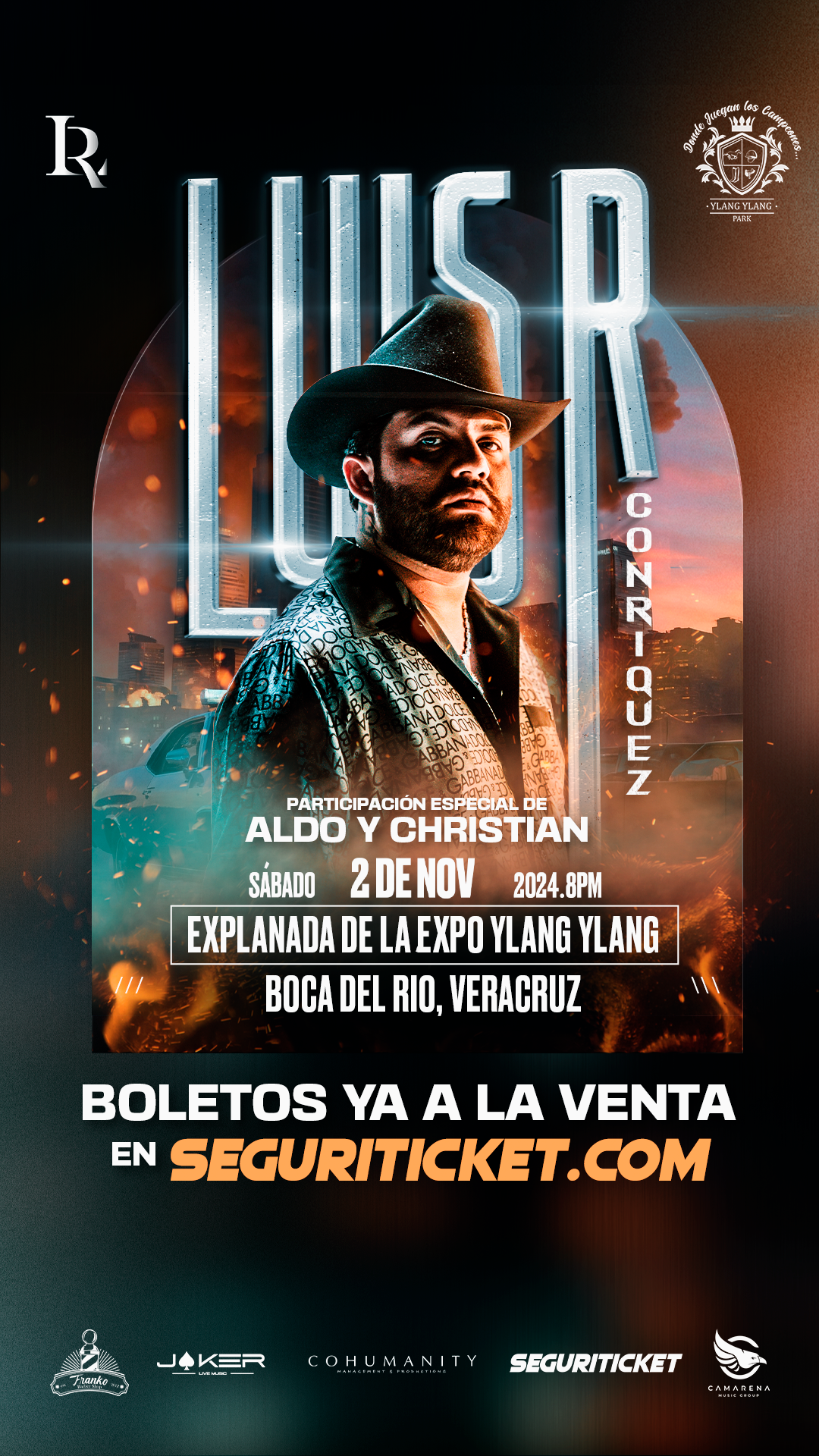 El sonorense Luis R Conriquez, se presentará en la explanada de la Expo Ylang Ylang de Boca del Río, el próximo 2 de noviembre del presente año, dónde cautivará con sus interpretaciones a los ahí presentes, ya que pone pasión en cada tema que canta, como : Si no quieres no, Que se cuide, Malas rachas, El Búho, entre muchos más, haciendo que tanto jóvenes como mayores se unan en admiración a este gran talento.