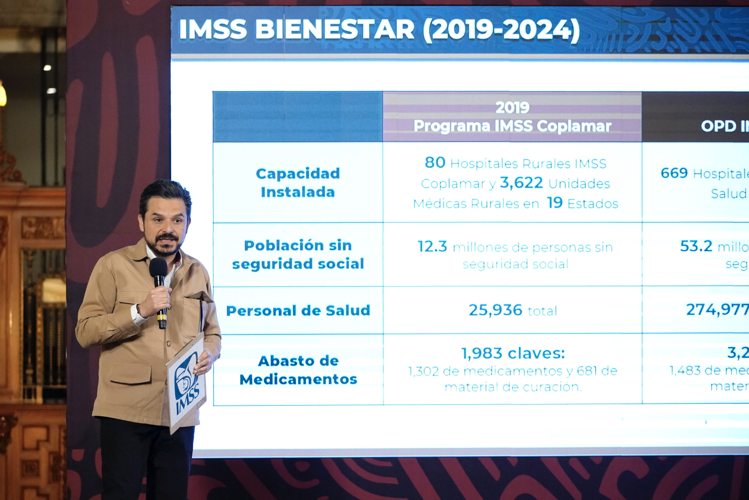 Explicó que este programa contaba con 80 hospitales, tres mil 622 Unidades Médicas Rurales y operaban en 19 estados; hoy el OPD IMSS-Bienestar tiene 669 hospitales, 11 mil 935 Centros de Salud en 28 estados, ya que hay algunas entidades donde existe solamente el Coplamar y por eso se cuentan.