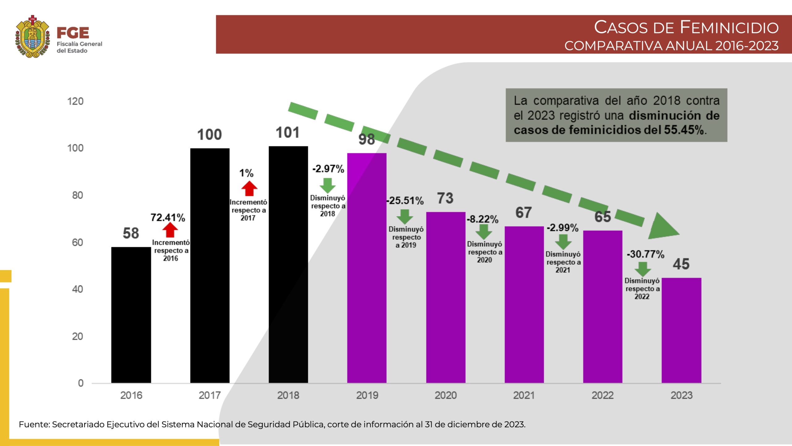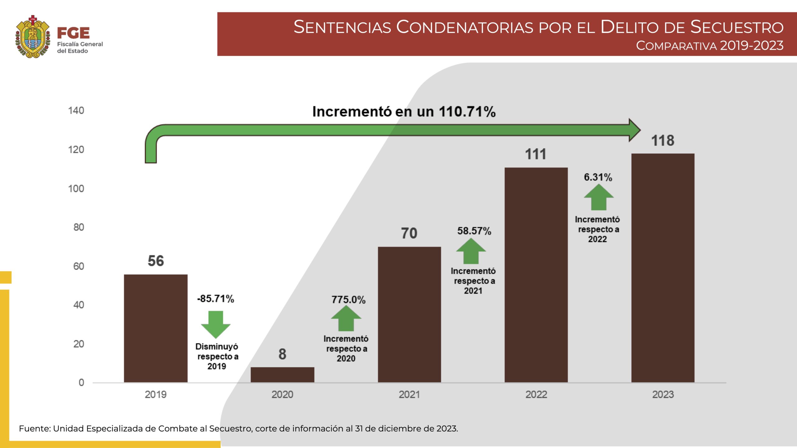 En lo que va del sexenio, el número de homicidios dolosos redujo en un 52 por ciento, las detenciones incrementaron un 53% y las sentencias un 439%. En cuanto al secuestro, decreció un 91% y un 110% recibió condenas. Por su parte, el feminicidio bajó 55.45% y las sanciones se elevaron en 457%.