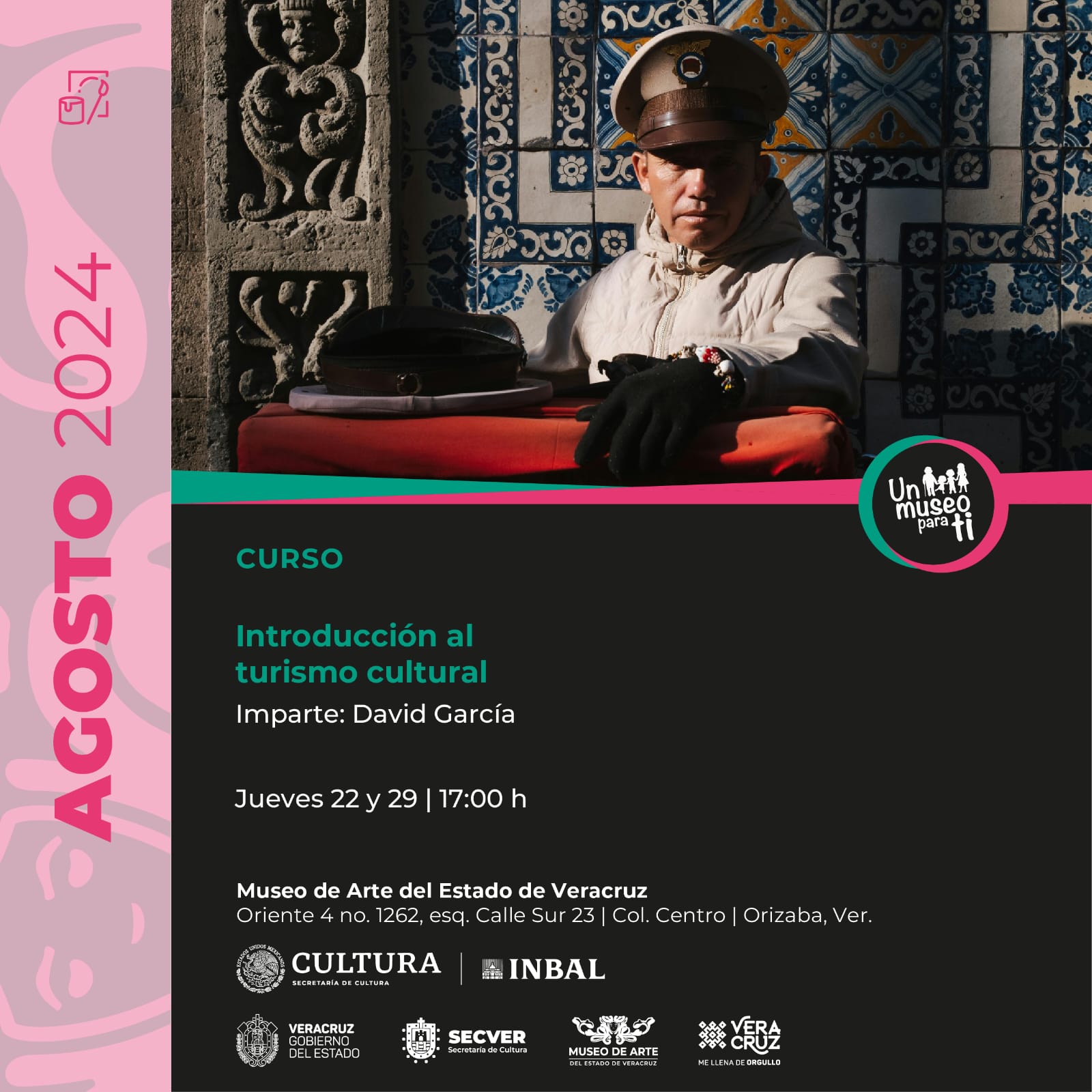 La Secretaría de Cultura de Veracruz invita a personas vinculadas con el turismo, emprendedores en al ámbito turístico y público en general al curso Introducción al turismo cultural que será impartido los jueves 22 y 29 de agosto, a las 17:00 horas, en el Museo de Arte del Estado de Veracruz. La actividad es gratuita.