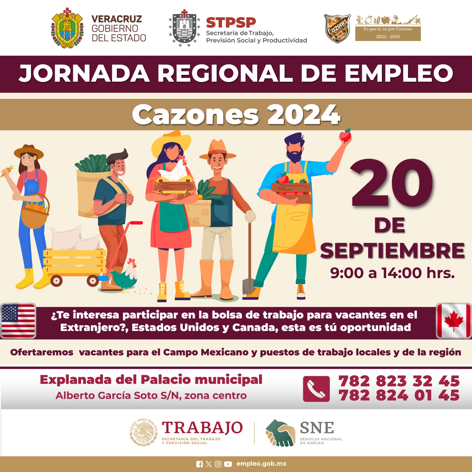 Xalapa, Ver., 17 de septiembre de 2024.- El Servicio Nacional de Empleo (SNE), a través de la Secretaría del Trabajo, Previsión Social y Productividad, invitan a la ciudadanía en búsqueda de empleo a participar en los reclutamientos presenciales los días 19 y 20 de septiembre en Xalapa, Chalma y Cazones de Herrera.