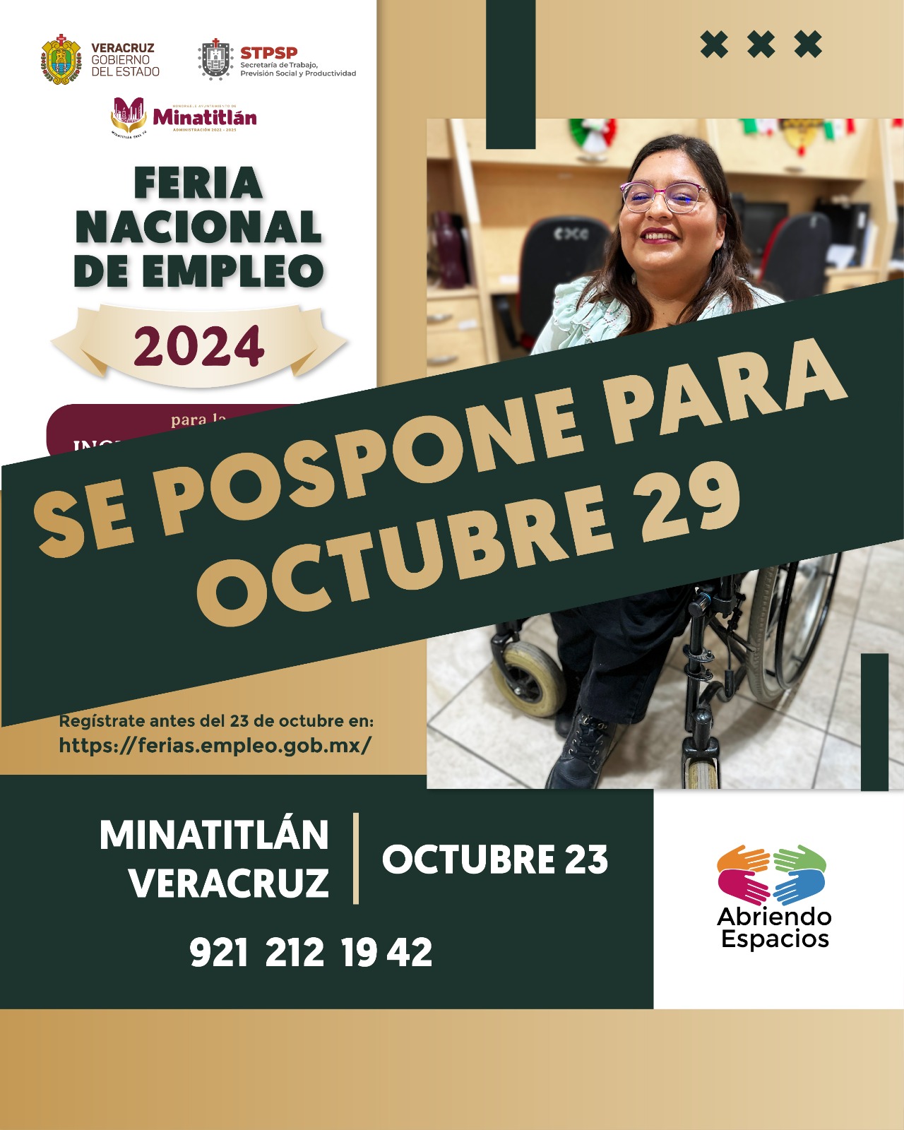 La Feria Nacional del Empleo para la Inclusión Laboral que iniciaba este miércoles 23 de octubre en el municipio de Minatitlán fue aplazada y será llevada a cabo el próximo 29, lo anterior, en atención a las recomendaciones de la Secretaría de Protección Civil, ante las afectaciones derivadas por el paso de la Tormenta Tropical “Nadine”.