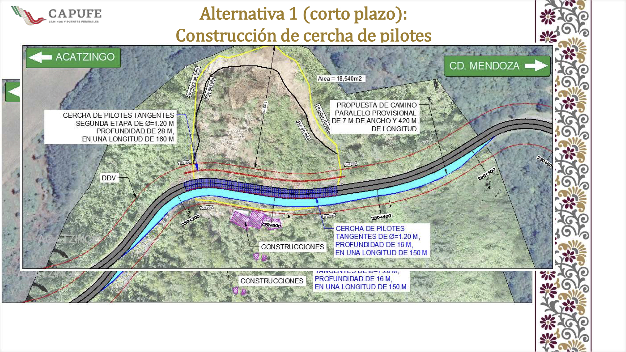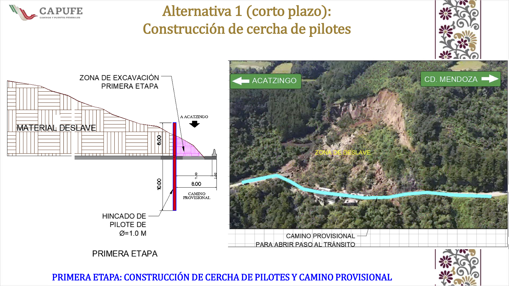 Dado que el terreno sigue inestable y puede haber más movimientos de tierra, la solución inmediata es un hincado de pilotes para contener el material y soportar el paso vehicular en al menos 420 metros, propuesta que avaló la presidenta Claudia Sheinbaum Pardo e instruyó iniciar lo antes posible.