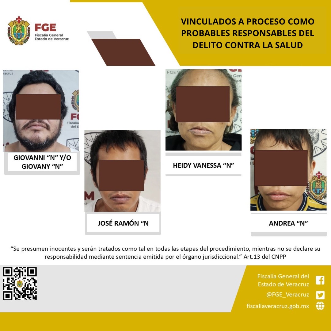 Coatzacoalcos, Ver.-La Fiscalía Regional Coatzacoalcos obtuvo vinculación a proceso en contra de Giovanni “N” y/o Giovany “N”, José Ramón “N”, Heidy Vanessa “N” y Andrea “N” como probablesresponsables del delito contra la salud.