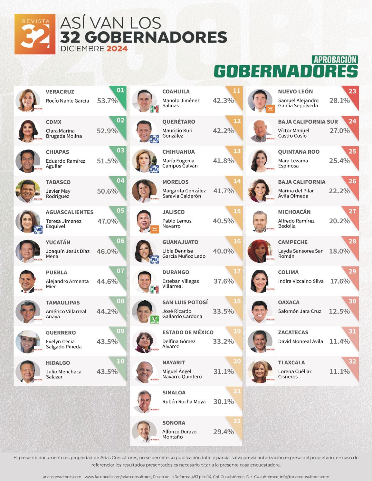 Nahle García continúa liderando la lista de aprobación general de los 32 mandatarios