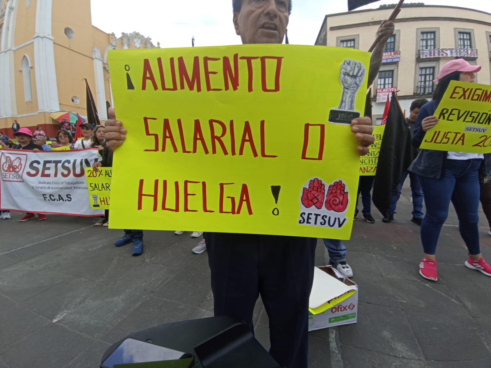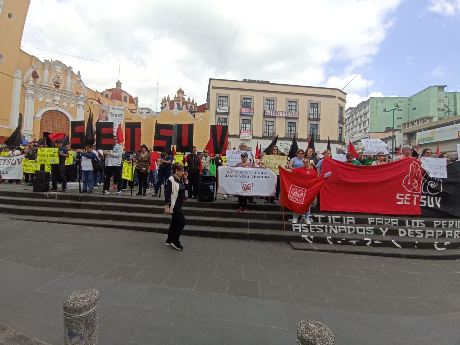 Xalapa, Ver.- Afiliados del Sindicato Estatal de Trabajadores al Servicio de la Universidad Veracruzana (SETSUV), se manifestaron en la Plaza Sebastián Lerdo de Tejada de la ciudad de Xalapa para exigir a las autoridades universitarias paguen la homologación salarial a los trabajadores que sus percepciones están por debajo del salario mínimo.