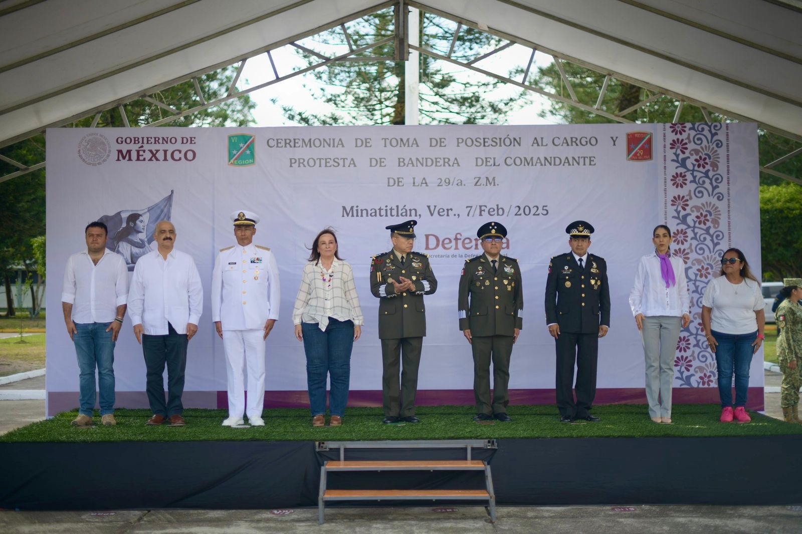 Minatitlán, Ver., viernes 07 de febrero de 2025.– La gobernadora Rocío Nahle García asistió a la ceremonia de Toma de Posesión y Protesta del nuevo comandante de la 29ª Zona Militar en Minatitlán, Antonio Alejandro Ramos Argüello, como parte de las estrategias de seguridad y reiterando el compromiso con el bienestar de las y los veracruzanos.