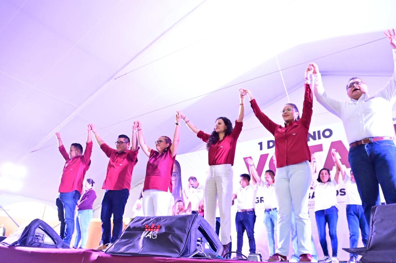 Xalapa, Ver..- Arropada por distintos grupos sociales, sindicales, empresariales, magisteriales y por xalapeñas y xalapeños de las más de 400 colonias de la ciudad, la candidata a la presidencia municipal de Xalapa por la coalición Sigamos Haciendo Historia, Daniela Griego Ceballos, cerró su campaña electoral este martes, acompañada por liderazgos nacionales y estatales de Morena así como representantes del Partido Verde Ecologista de México con quienes van en alianza a la contienda.